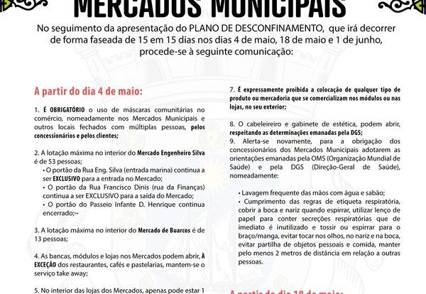 Aviso: Uso de máscara nos Mercados Municipais Proteja-se. Proteja os outros. Faça as suas compras em segurança.Covid-19 -