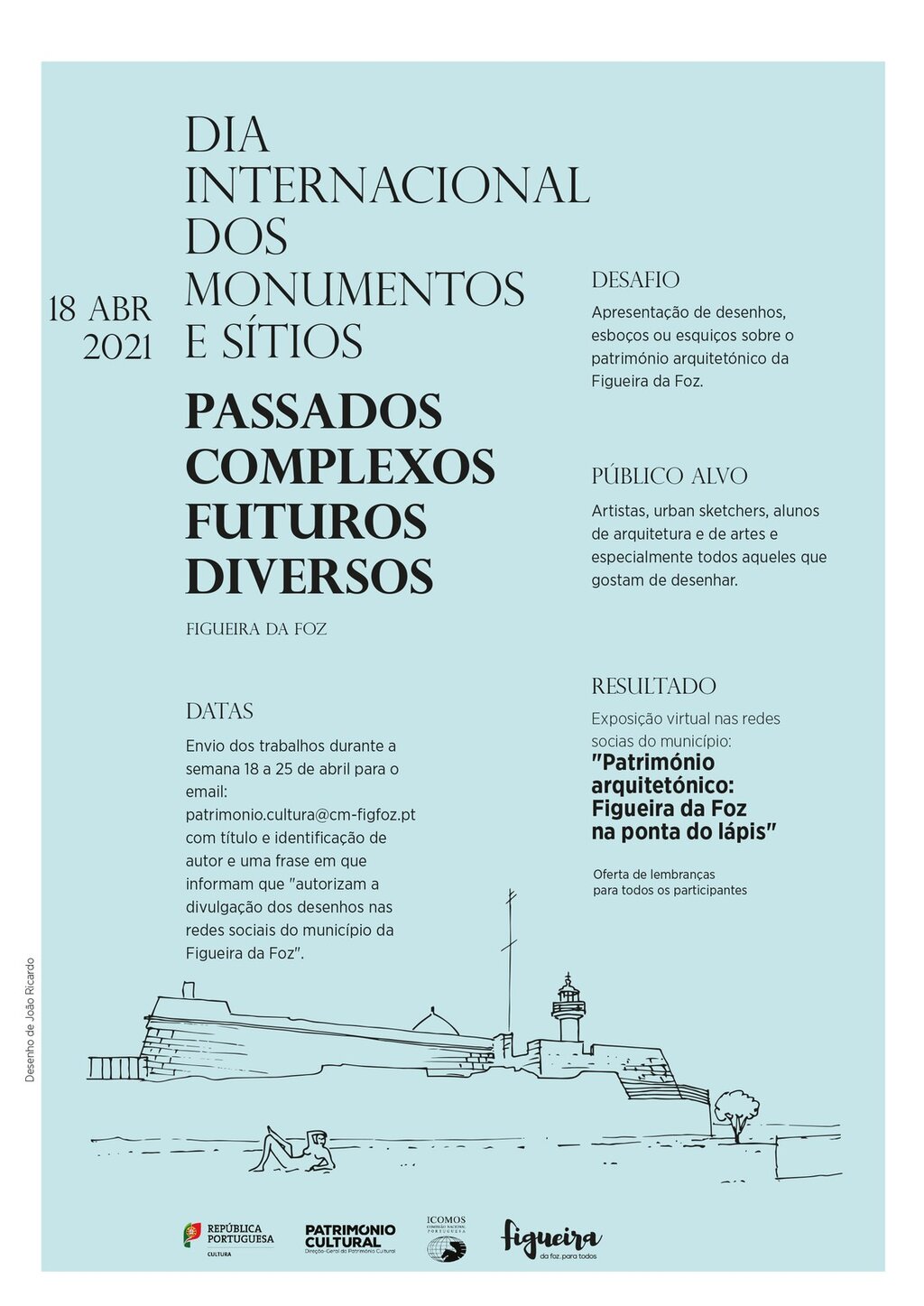 Os interessados deverão enviar os seus trabalhos para o email patrimonio.cultura@cm-figfoz.pt, até ao dia 25 de abril, com título e identificação do autor, informando também que "autorizam a divulgação dos desenhos nas redes sociais do município da Figueira da Foz".