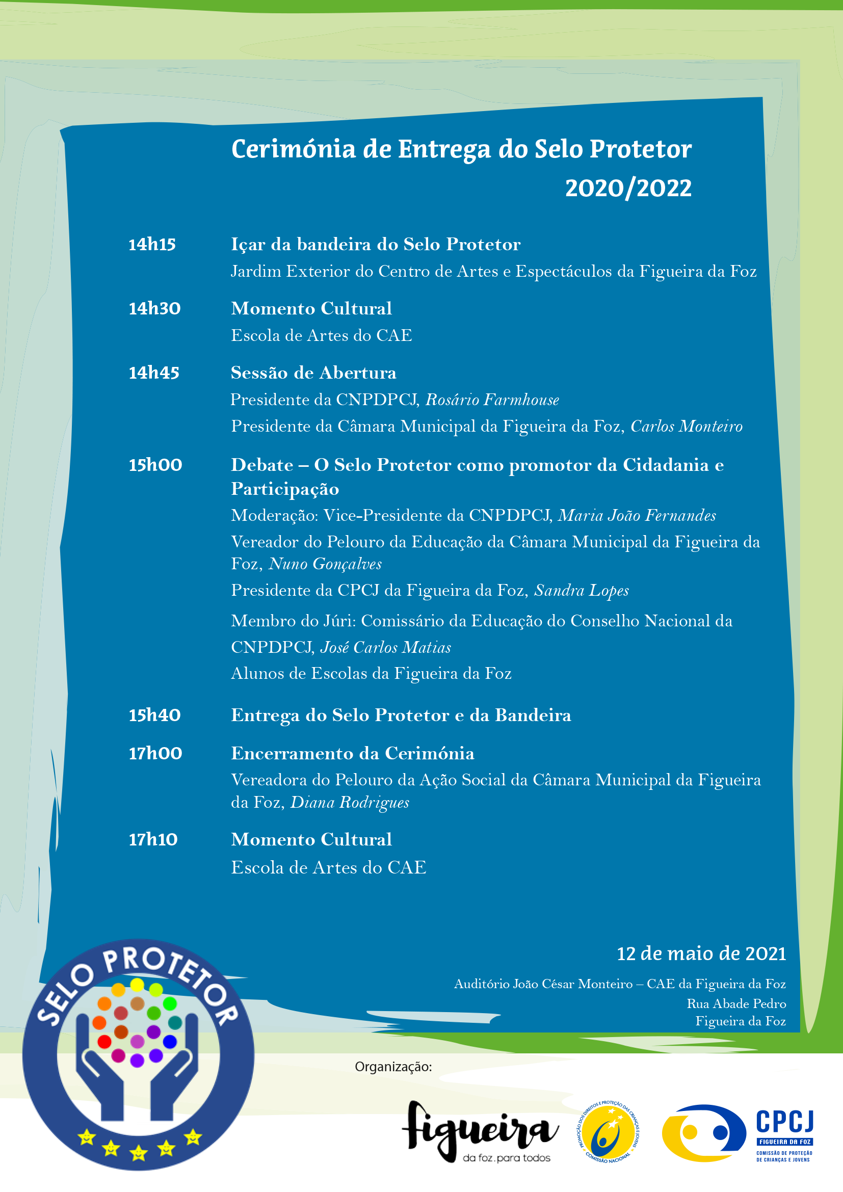 A Cerimónia é organizada pela CNPDPCJ, pelo Município da Figueira da Foz e pela Comissão de Crianças e Jovens da Figueira da Foz , integra, para além da entrega dos Selos Protetores a 25 entidades, vários momentos culturais e um debate “O Selo Protetor como promotor da Cidadania e Participação”, e será transmitida em direto no Facebook da CNPDPCJ e no canal de Youtube do Município.