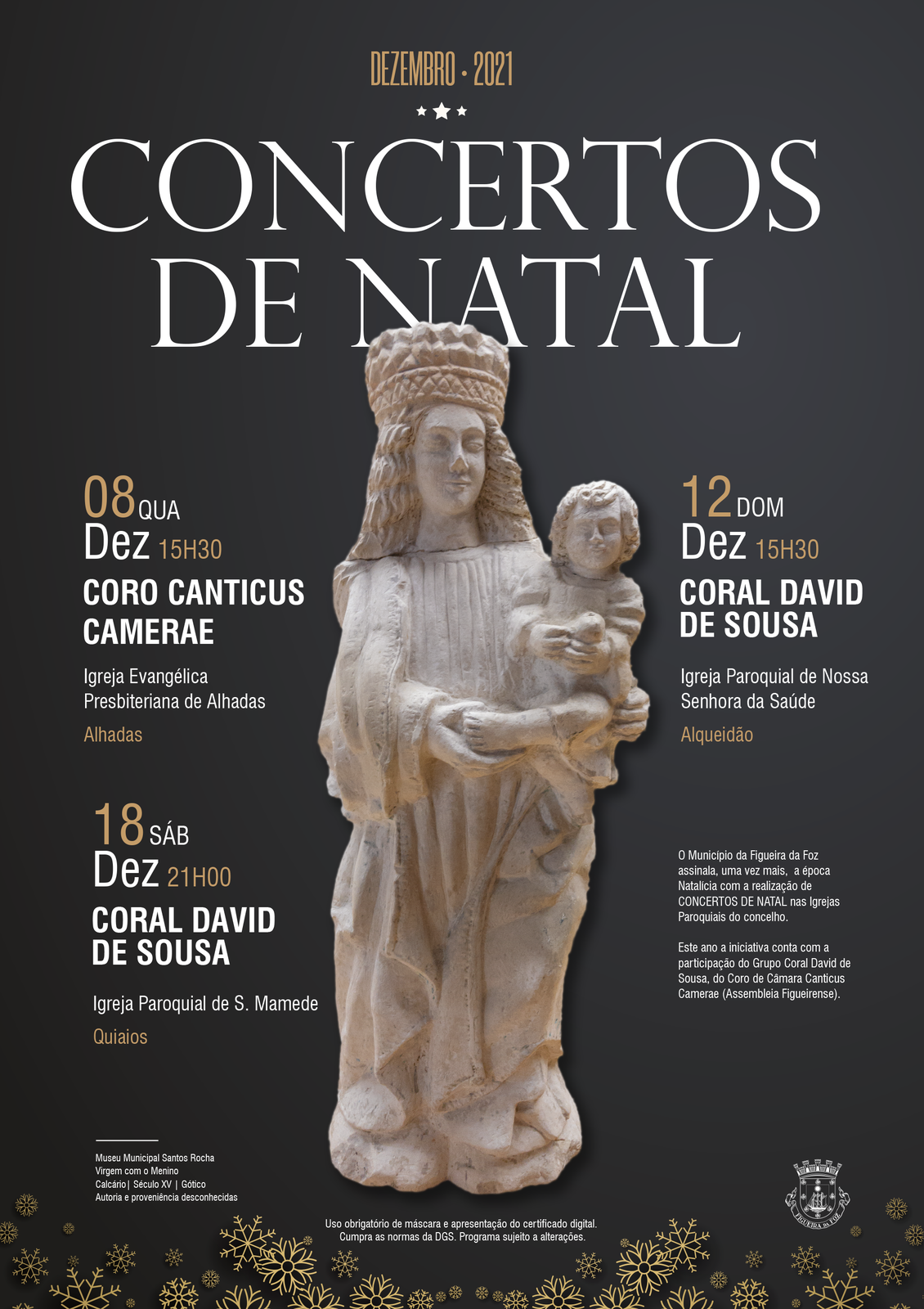 O périplo dos «Concertos de Natal» irá ter início dia 8 de dezembro, pelas 15h30 na Igreja Evangélica Presbiteriana de Alhadas, onde atuará o Coro de Câmara Canticus Camerae da Assembleia Figueirense, sob direção da Maestrina Alexandra Curado. Segue-se a Igreja Paroquial de Nossa Senhora da Saúde, no Alqueidão, dia 12 de dezembro, também pelas 15h30. O concerto estará a cargo do grupo Coral David de Sousa, sob direção do Maestro Vitor Ferreira. Para terminar, o Coral David de Sousa voltará a atuar no dia 18 de dezembro, pelas 21h00, na Igreja Paroquial de S. Mamede, em Quiaios.
