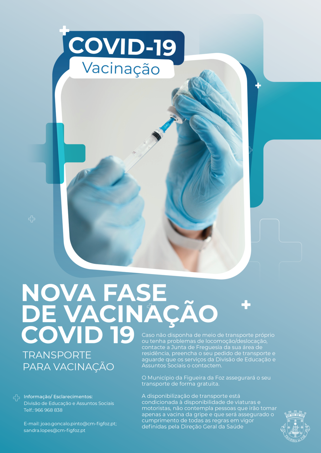 Tendo em conta a nova fase de abertura do Centro de Vacinação da Figueira da Foz, sito no Centro de Formação da Guarda Nacional Republicana, para inoculação da terceira dose da vacina contra a covid-19, o município da Figueira da Foz irá disponibilizar um serviço de transporte gratuito para quem não disponha de meio de transporte próprio.