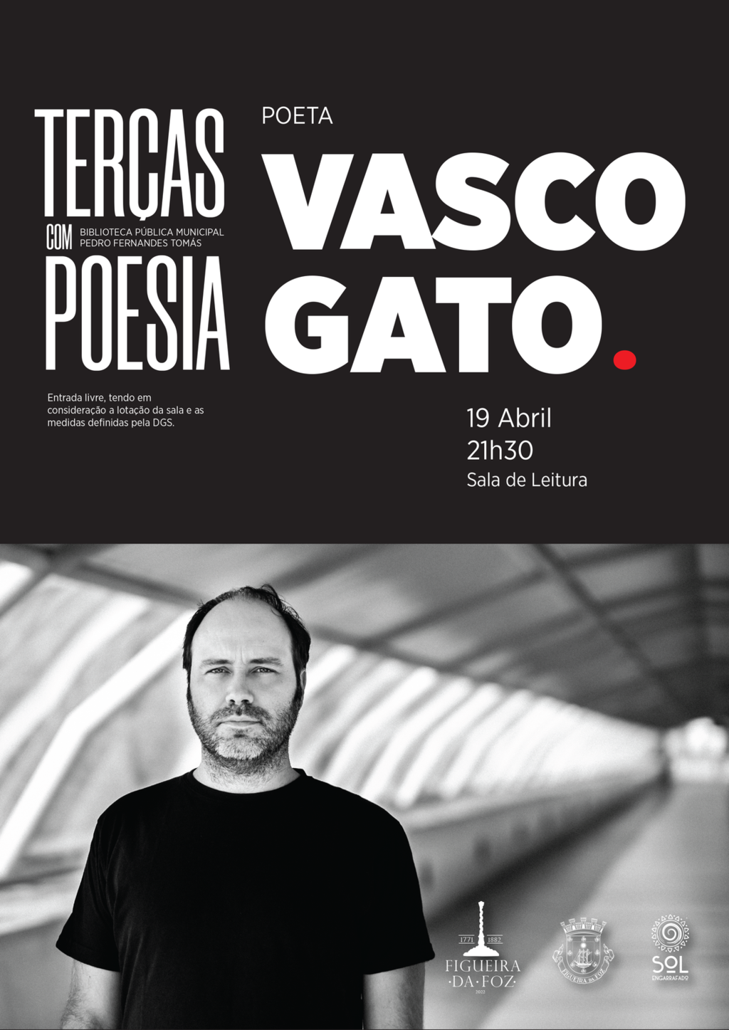 Na noite do dia 19 de abril de 2022, pelas 21h30, na Sala de Leitura da Biblioteca Municipal Pedro Fernandes Tomás, Vasco Gato apresenta a sua já extensa obra poética, naquela que é a 3ª sessão do ano das «Terças Com Poesia».