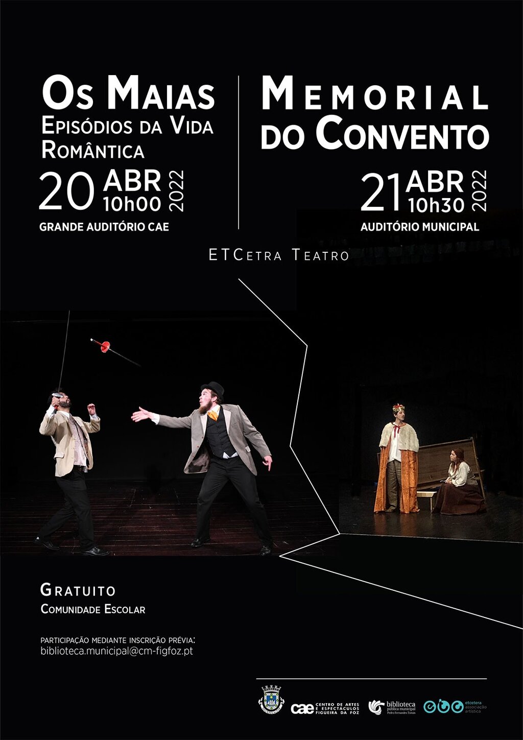 O Município da Figueira da Foz promove, nos dias 20 e 21 de abril, a apresentação de duas sessões teatrais pelo grupo EtCetera Teatro, que abordam obras literárias do currículo escolar dos alunos do ensino secundário.