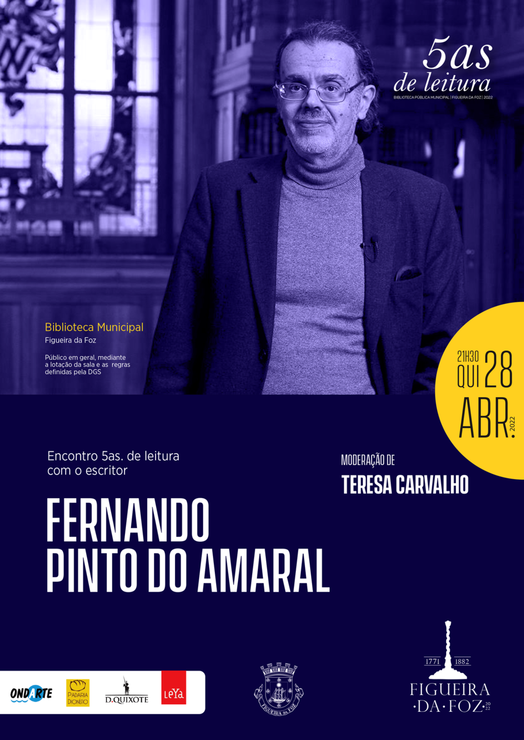 A próxima sessão das «5as de Leitura» acontece a 28 de abril, na Sala de Leitura da Biblioteca Municipal da Figueira da Foz, pelas 21h30, tendo como convidado o Professor Doutor Fernando Pinto do Amaral que, certamente, sob a moderação de Teresa Carvalho a todos irá surpreender pelo vasto espólio literário, cuja transversalidade é uma realidade indiscutível: poesia, prosa, ensaios, prefácios e tradução de obras de muitos poetas.