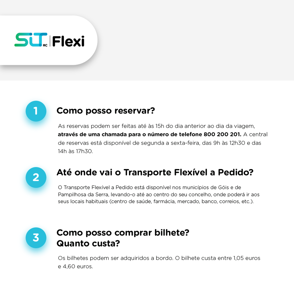 O Transporte Flexível a Pedido é um serviço de transporte público, para o qual o passageiro efetua previamente a reserva da viagem para que as viaturas se desloquem às paragens com reservas. O serviço de reservas funciona de segunda a sexta-feira, entre as 9h e as 15h, sendo que as reservas deverão ser efetuadas até às 15h do dia anterior ao dia da viagem, através de uma chamada gratuita para o número de telefone 800 200 201.