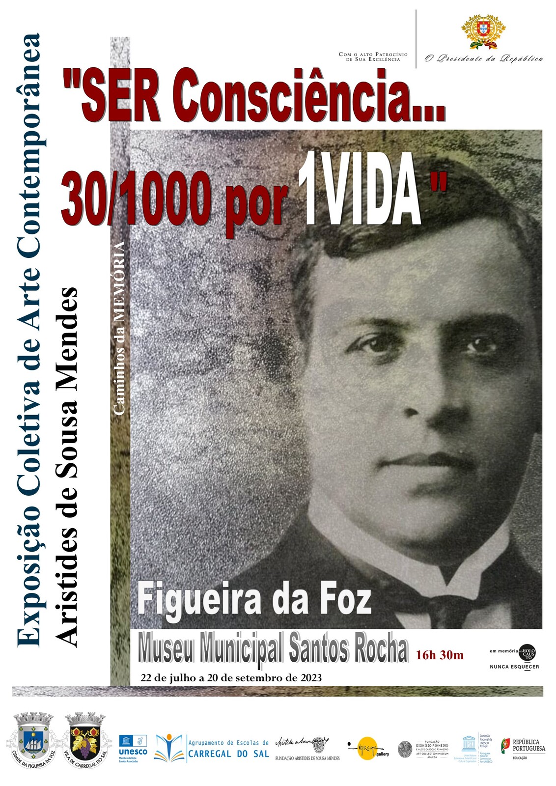 A exposição coletiva e itinerante “SER Consciência…30/1000 por 1VIDA” – caminhos da Memória, constituída por pintura, escultura, desenho, técnicas mistas, caricatura, cartoon e contributos literários, em homenagem a Aristides de Sousa Mendes, insere-se nas atividades planificadas no Projeto UNESCO “Dever de Memória – jovens pelos direitos humanos”, que se centra na figura deste Humanista, no contexto do holocausto, 2ª Guerra Mundial e nos Direitos Humanos, assentando em três pilares: educativo, divulgação e memória, do Agrupamento de Escolas de Carregal do Sal,