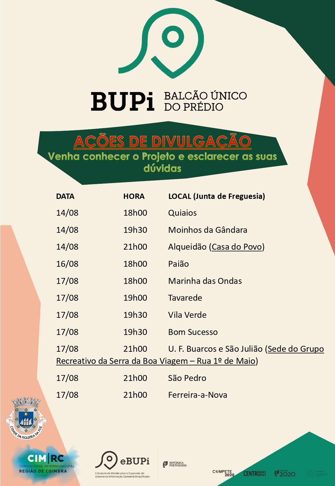 Adicionalmente, a empresa irá apoiar os técnicos do BUPi Figueira da Foz nos atendimentos, entre os dias 21 e 24 de agosto, nas freguesias de Vila Verde, Marinha das Ondas, Ferreira-a-Nova e Tavarede, respetivamente: