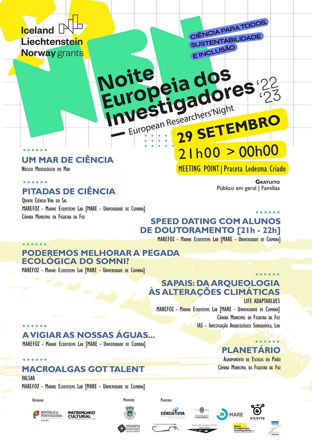 O Município da Figueira da Foz associa-se à comemoração da Noite Europeia dos Investigadores (NEI) e promove, dia 29 de setembro, no Meeting Point, na Praceta Ledesma Criado, entre as 21h00 e as 00h00, um conjunto de atividades gratuitas, direcionadas a público em geral e famílias com crianças. A celebração conta com uma forte colaboração da Universidade de Coimbra através dos investigadores do Laboratório MAREFOZ do MARE-Centro de Ciências do Mar e do Ambiente.