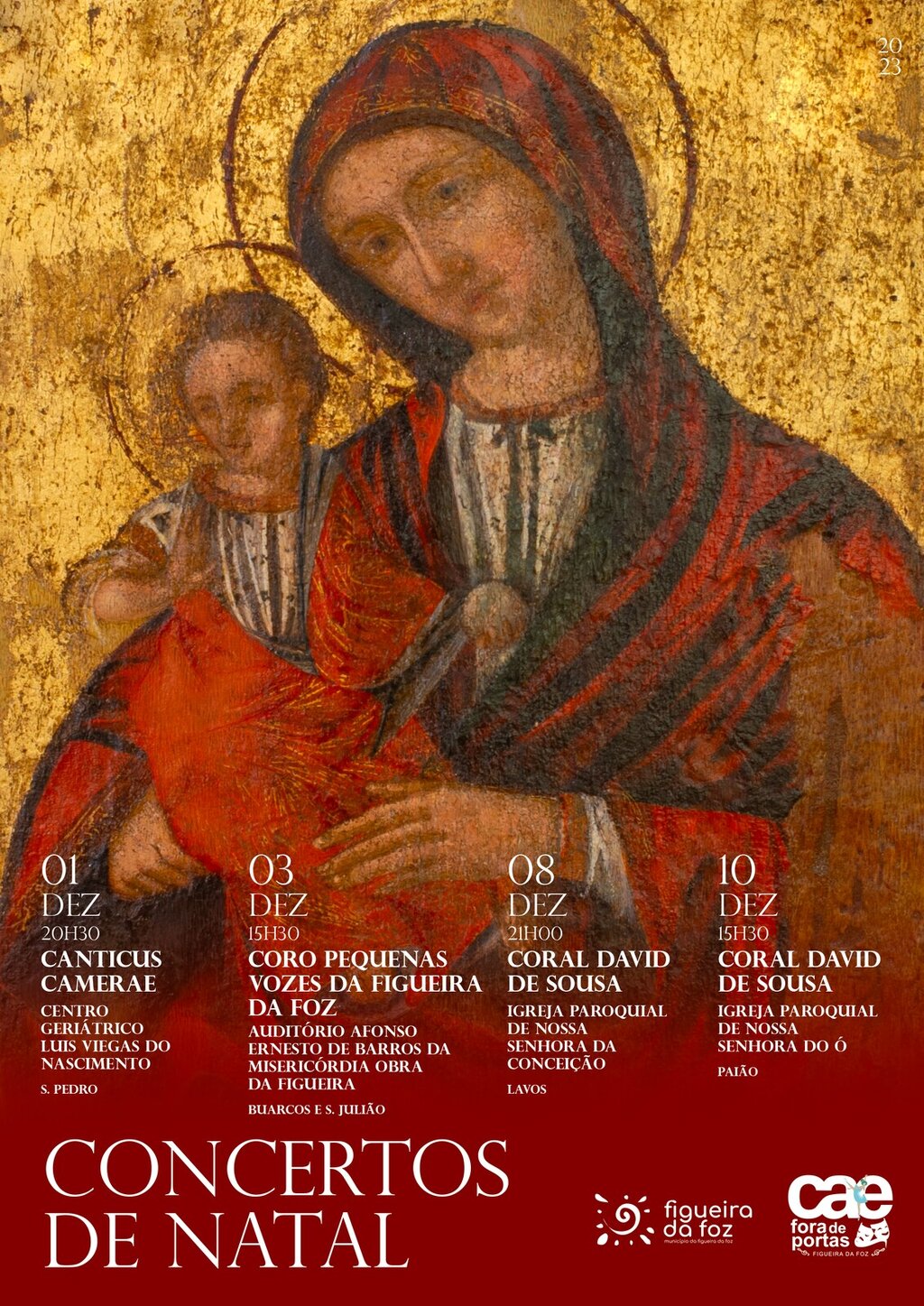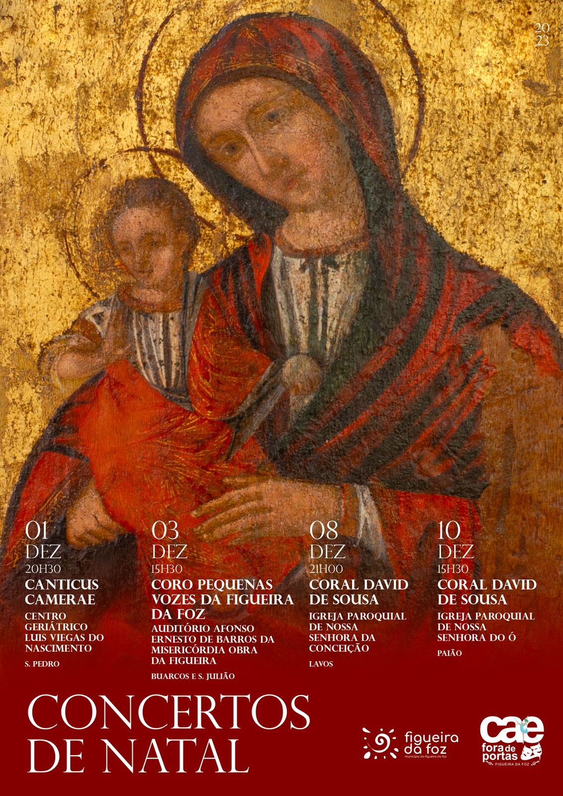Assim, os Concertos de Natal dos dias 01(20h30) e 03 de dezembro (15h30) realizar-se-ão, respetivamente, no Centro Geriátrico Luis Viegas do Nascimento (freguesia de São Pedro) onde atuará o Canticus Camerae e no Auditório Afonso Ernesto de Barros da Misericórdia Obra da Figueira (freguesia de Buarcos e São Julião), onde se ouvirá o Coro Pequenas Vozes da Figueira da Foz.
