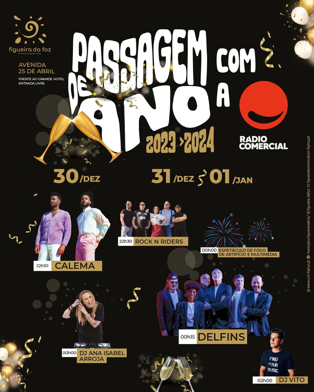 No dia 31 a banda figueirense Rock N Riders começa a "aquecer" o público às 22h30. À meia-noite o céu transforma-se num arco-íris brilhante, com o espetáculo de fogo de artifício e multimédia. Quinze minutos depois entram em palco os Delfins, para uma grande celebração: do Ano novo de 2024 e da marca dos 40 anos de canções.