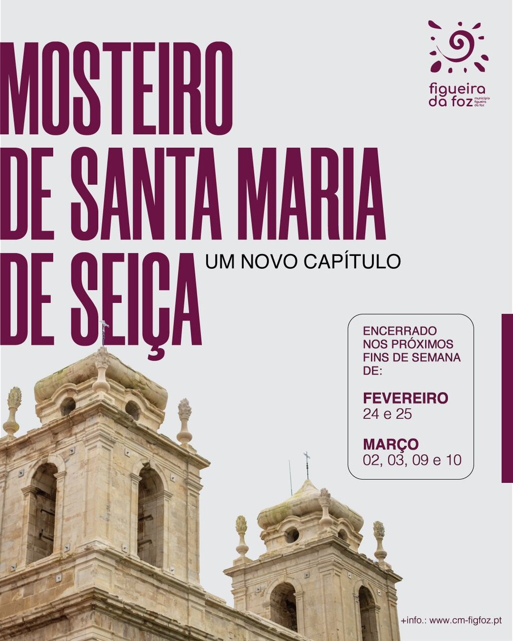 Devido à previsão de condições meteorológicas adversas para os próximos dois fins de semana e à realização das eleições para a Assembleia da República, o Mosteiro de Santa Maria de Seiça estará temporariamente encerrado nos dias 24 e 25 de fevereiro e 02, 03, 09 e 10 de março.