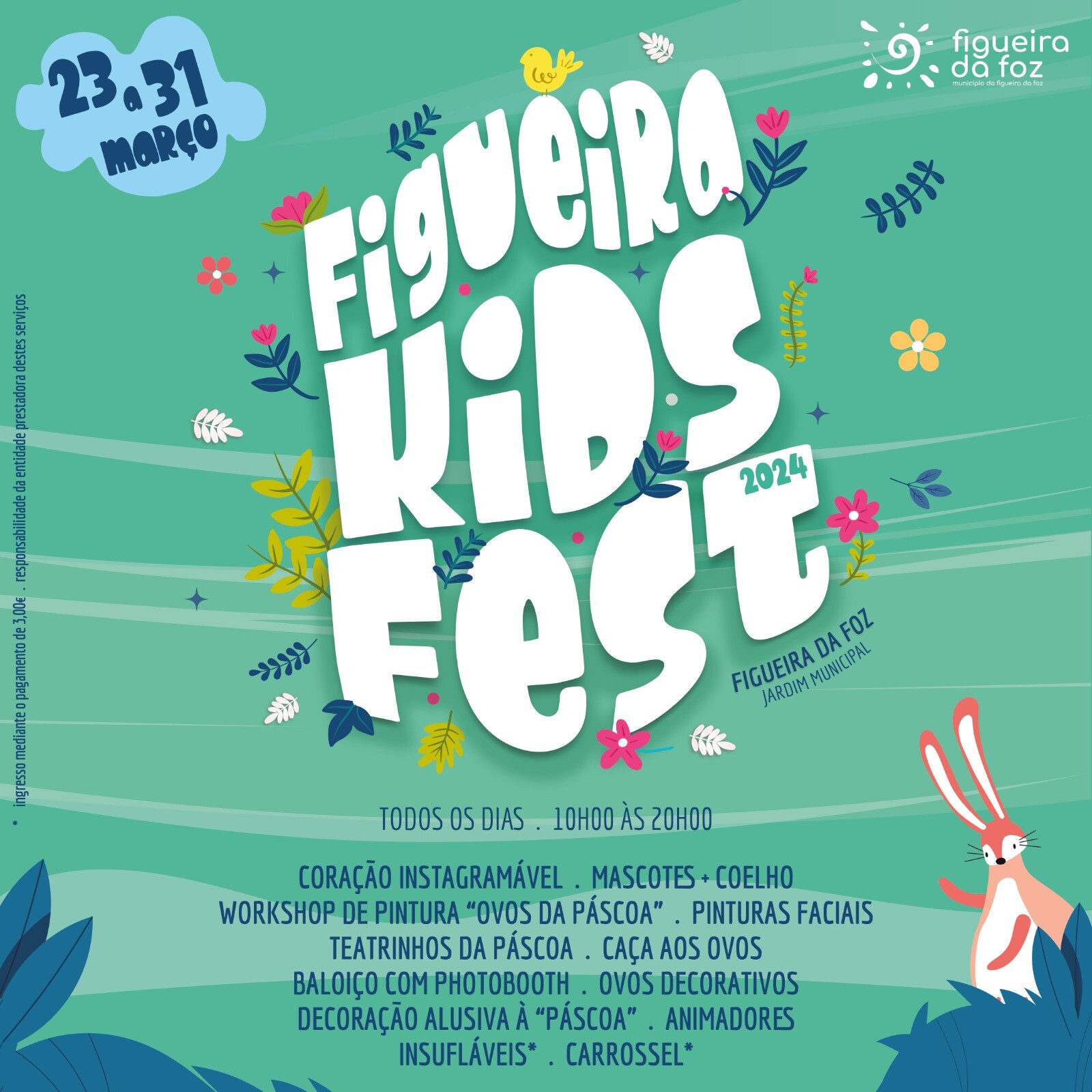 O Jardim Municipal recebe, de 23 a 31 de março de 2024, das 10h00 às 20h00, mais uma edição do “Figueira Kids Fest”, um evento pensado e direcionado em particular para o público infantil e famílias, mas que, no geral, irá ter atividades para diversos tipos de públicos.