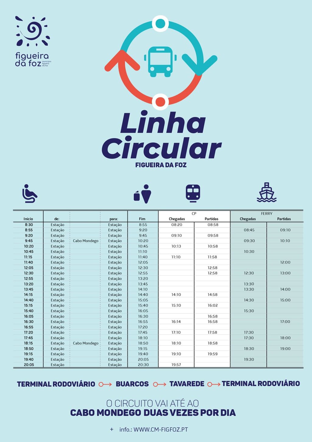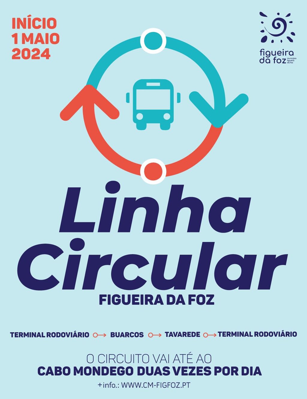 A Câmara Municipal da Figueira da Foz introduz a partir de amanhã, dia 1 de maio, uma nova oferta de transporte coletivo de passageiros, configurada pela linha Circular: Terminal Rodoviário – Buarcos - Tavarede – Terminal Rodoviário.