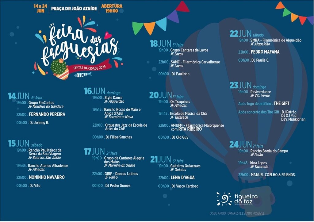 Com a celebração do São João, a edição de 2024 das Festas da Cidade vai animar a Figueira da Foz durante o mês de junho com a Feira de São João e a Feira das Freguesias, onde marcam presença os grupos locais e a gastronomia das freguesias.