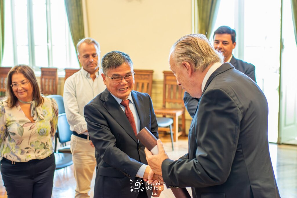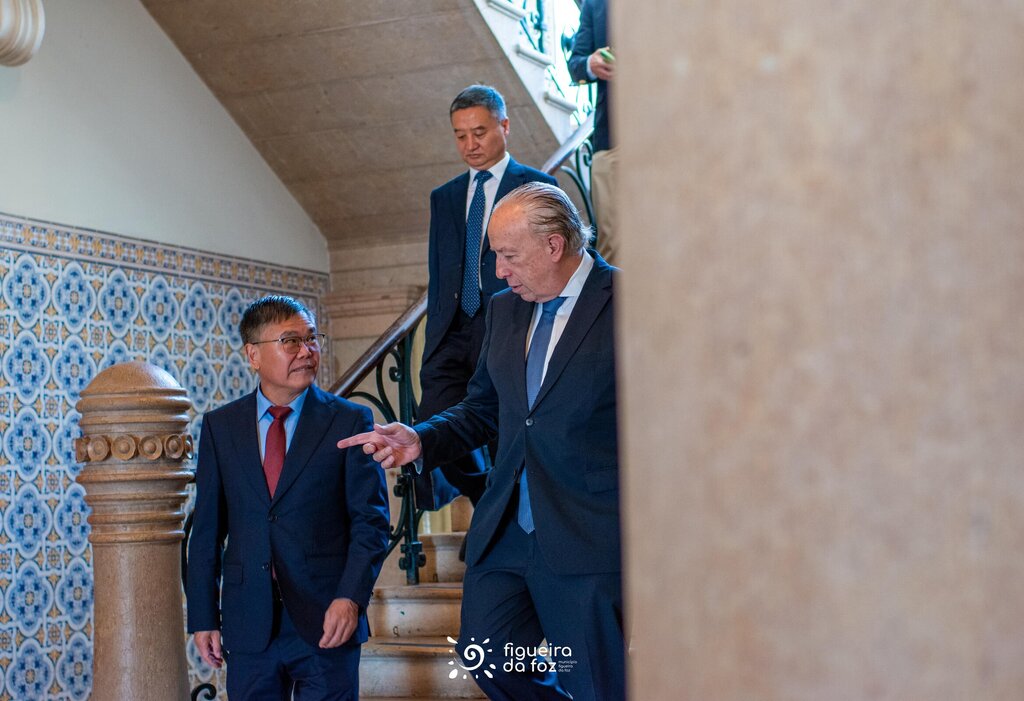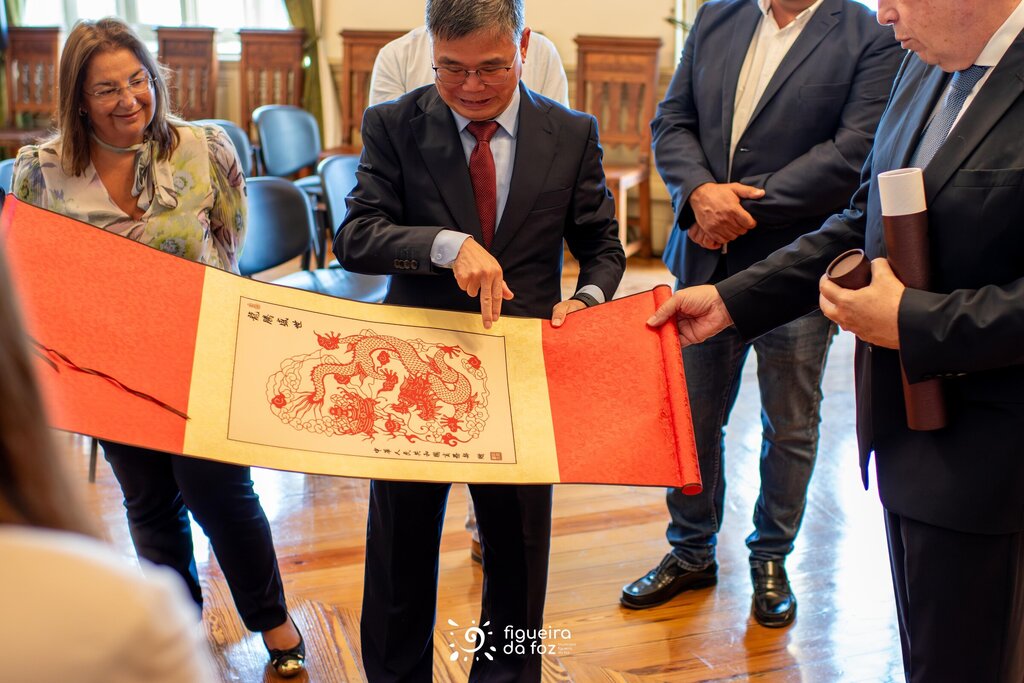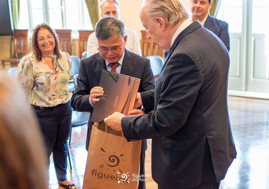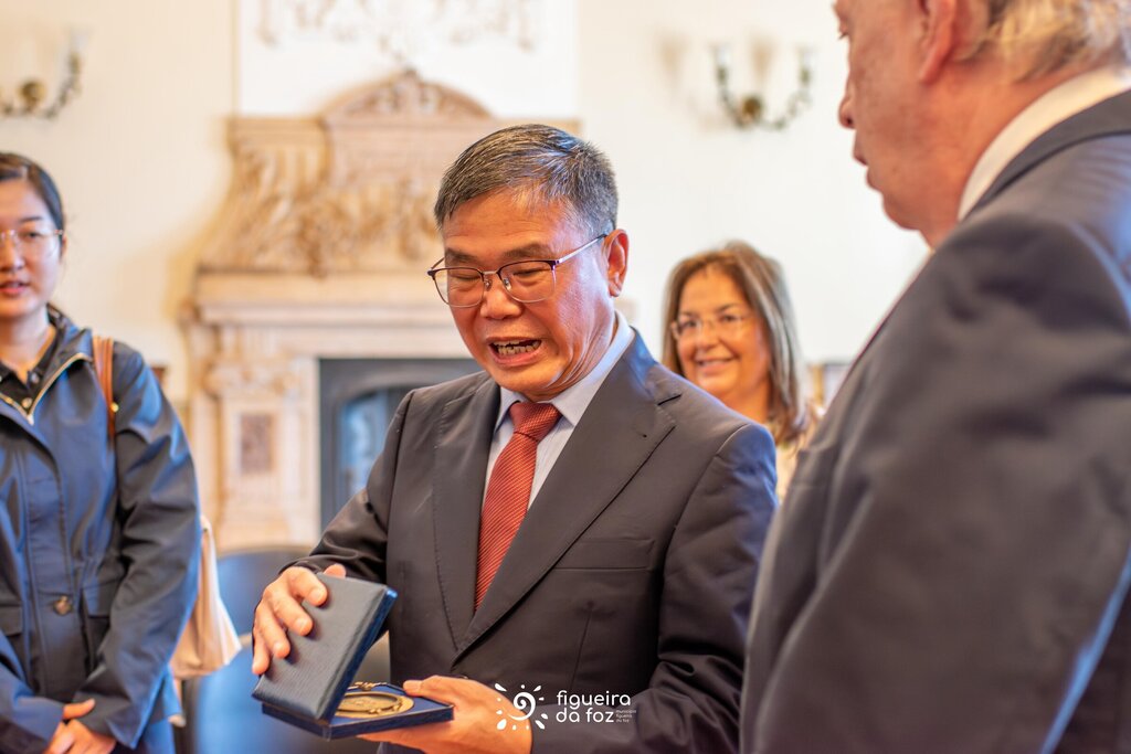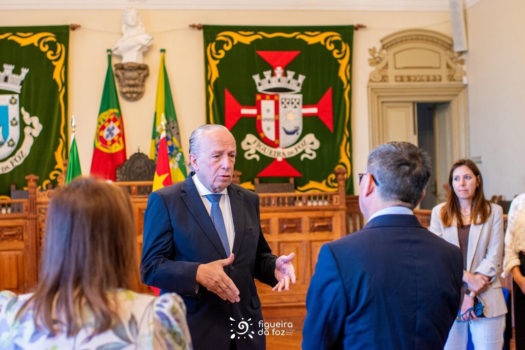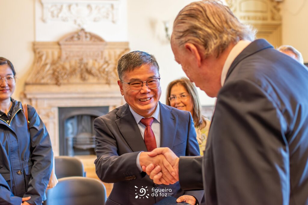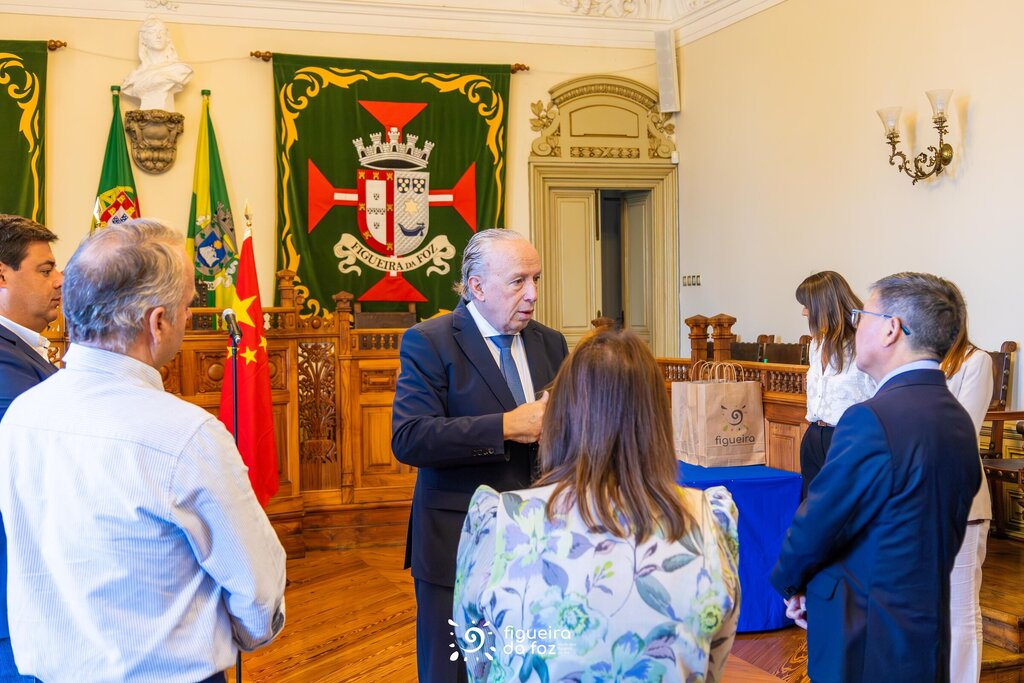 Pedro Santana Lopes deu as boas-vindas à comitiva e, numa breve conversa com o Embaixador Zhao Bentang, salientou a fase em que se encontra o concelho em termos de investimentos, maioritariamente na área da transição energética, muito por força da situação geográfica da Figueira da Foz.