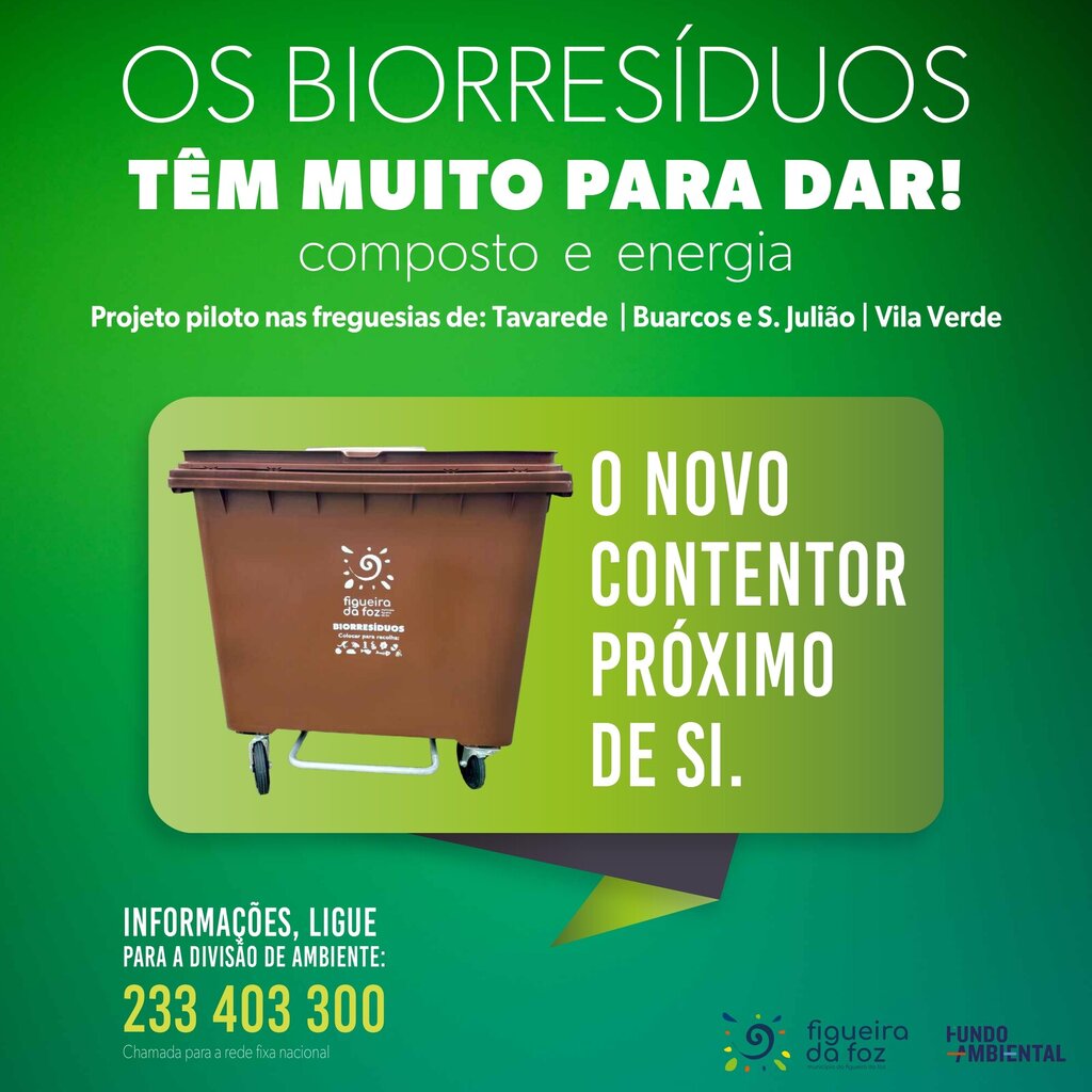 O Município da Figueira da Foz arrancou ontem com a primeira fase do Projeto “OS BIORRESÍDUOS TÊM MUITO PARA DAR!”, na freguesia de Tavarede, com cerca de 10.051 habitantes, seguindo gradualmente para as freguesias de Buarcos e S. Julião e Vila Verde, com um total de 350 contentores castanhos de 800 litros a serem instalados, permitindo abranger a área geográfica das três freguesias, com um dos maiores focos de densidade populacional, um total de 31107 habitantes.