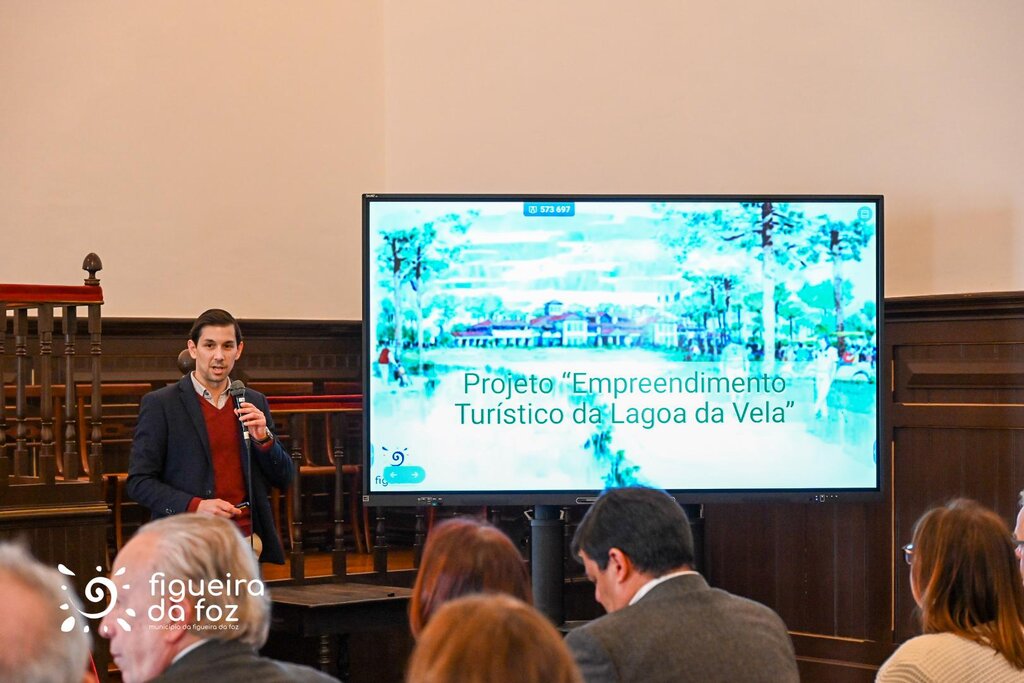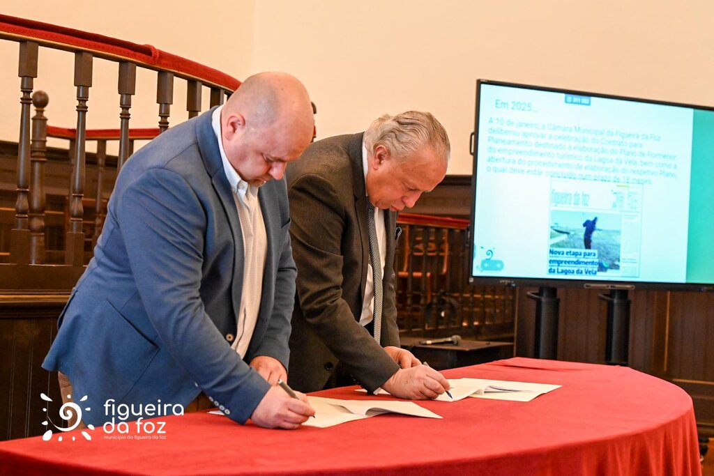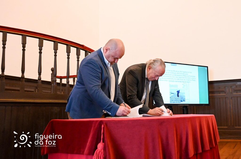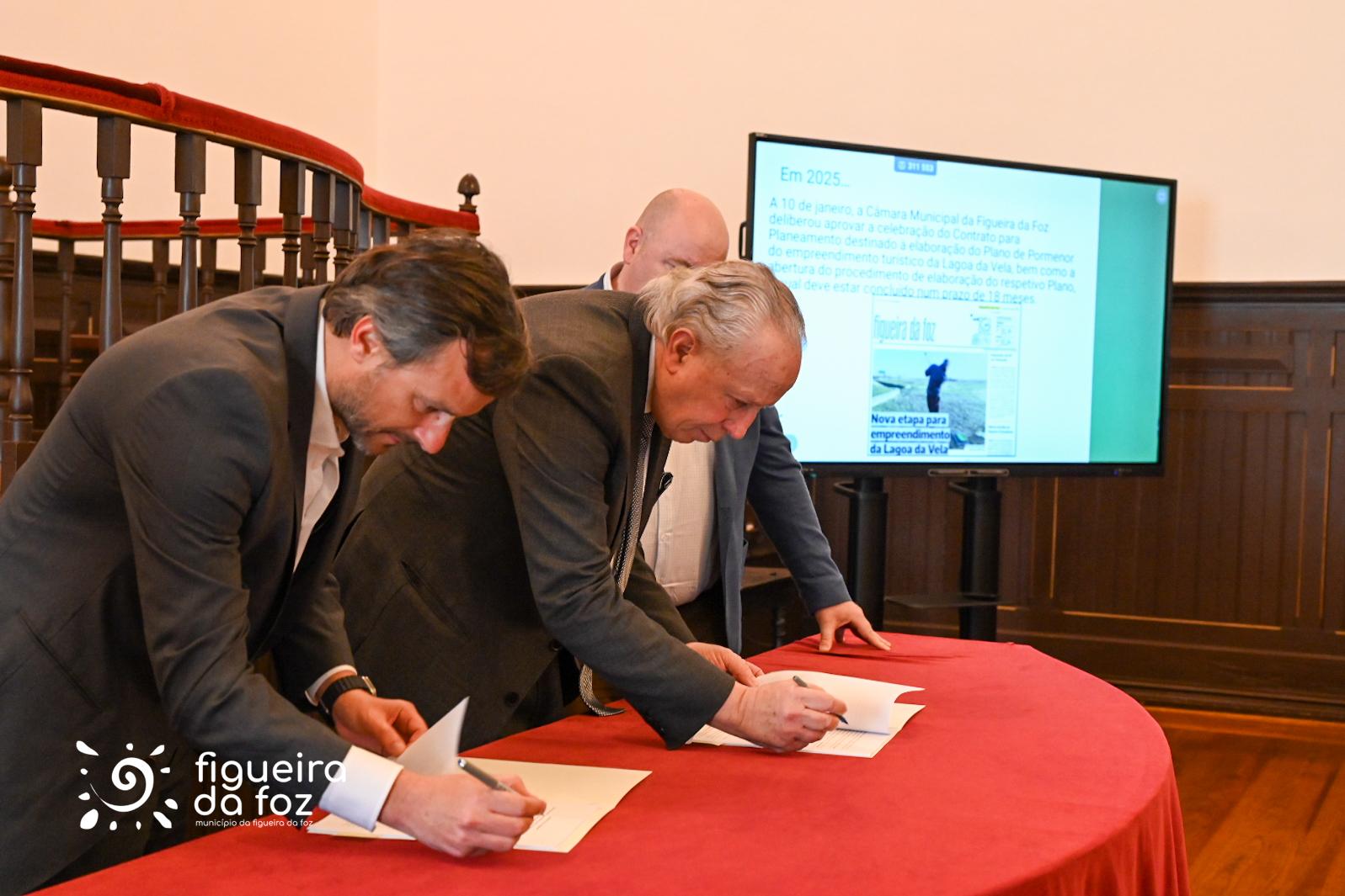 Pedro Santana Lopes, presidente da Câmara Municipal da Figueira da Foz, e Sean Moriarty e Miguel Abecasis Pinto de Sousa, administradores da empresa, assinaram o documento que irá permitir avançar com a fixação de normas e parâmetros de edificabilidade numa área de 100 hectares, junto à Lagoa da Vela.