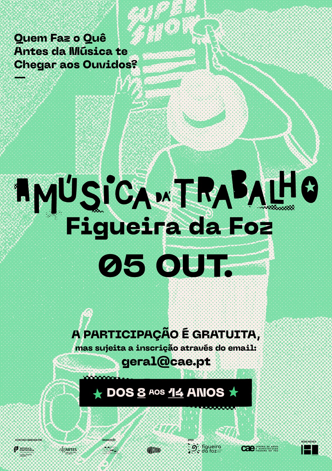 “A Música dá Trabalho” é um projeto dirigido a crianças e jovens dos 8 aos 14 anos. A participação é gratuita, mas sujeita a inscrição através do email: geral@cae.pt , até ao dia 2 de outubro. Os interessados podem inscrever-se numa das duas sessões, a realizar pelas 14h30 e 16h00, seguidas, pela 17h00, de um Concerto.
