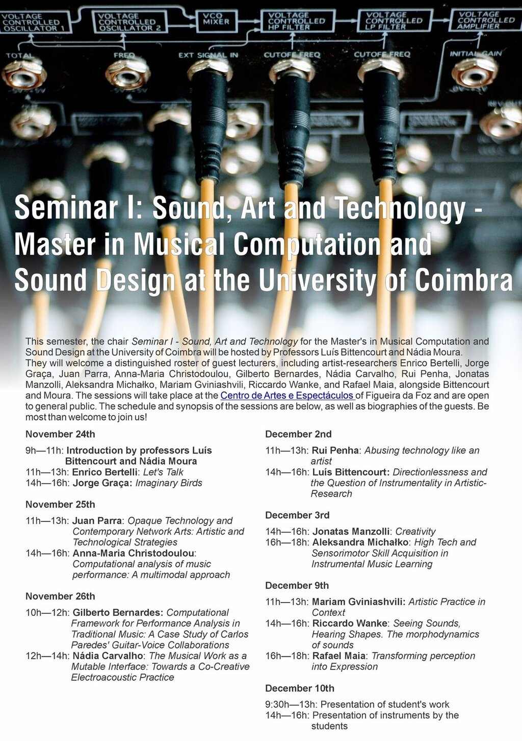 As palestras, apresentadas em inglês, têm lugar dias 24, 25 e 26 de novembro, 2, 3 e 9 de dezembro, entre as 9h00 e as 13h00 e as 14h00 e as 18h00, e convidam estudantes, profissionais e o público em geral a envolver-se com artistas e investigadores cujos trabalhos expandem as possibilidades do som, da performance e da arte computacional.