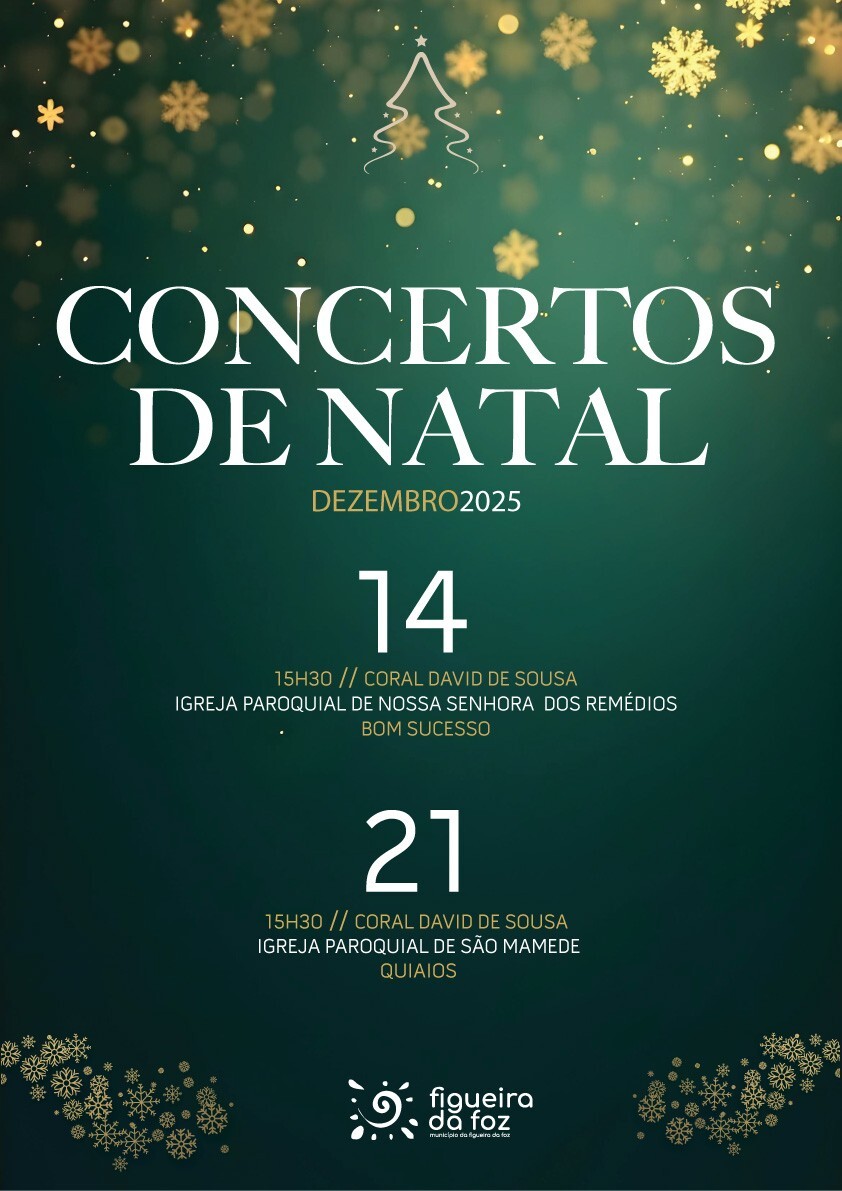 Contudo, o programa dos Concertos de Natal 2025 prossegue com as datas e horários dos concertos previstos realizar pelo Grupo Coral David de Sousa, sob a direção do Maestro Vítor Ferreira. Assim, dia 14, pelas 15h30, o Coral atua na Igreja Paroquial de Nossa Senhora dos Remédios, Bom Sucesso. No dia 21 de dezembro, também pelas 15h30, na Igreja Paroquial de São Mamede, Quiaios.