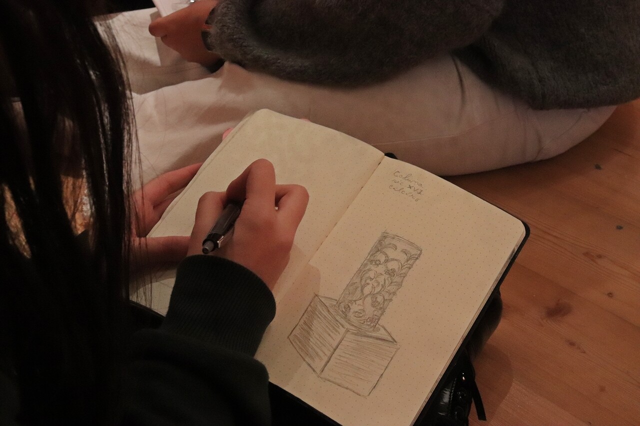 Após a visita, os participantes foram desafiados a realizar desenho de observação à vista, registando motivos arquitetónicos, espaciais ou artísticos inspirados no Mosteiro de Seiça e nas obras expostas. Este exercício procurou estimular o olhar crítico, a relação direta com o espaço patrimonial e a tradução criativa da experiência vivida, cruzando aprendizagem, fruição cultural e prática artística.