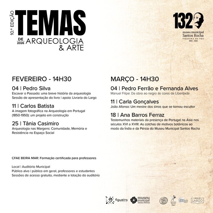 O Município da Figueira da Foz promove, no ano em que o Museu Municipal Santos Rocha assinala o seu 132.º aniversário, a 10.ª edição do ciclo de conferências «Temas de Arqueologia», que ao completar uma década de realização alarga a temática das conferências à Arte.
