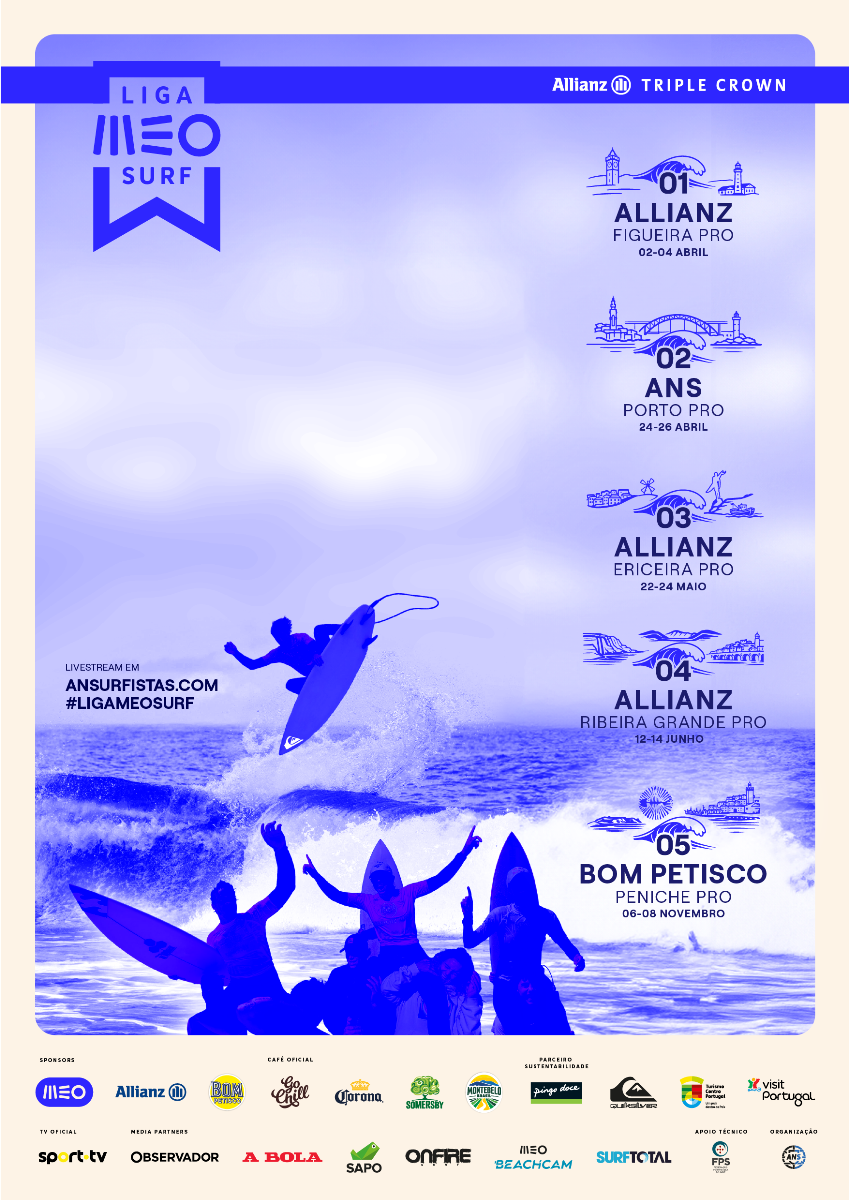 As restantes provas do calendário da Liga MEO Surf 2026 realizam-se: de 24 a 26 de Abril – ANS Porto Pro; de 22 a 24 de Maio – Allianz Ericeira Pro; de 12 a 14 de Junho – Allianz Ribeira Grande Pro e de 06 a 08 de Novembro – Bom Petisco Peniche Pro.