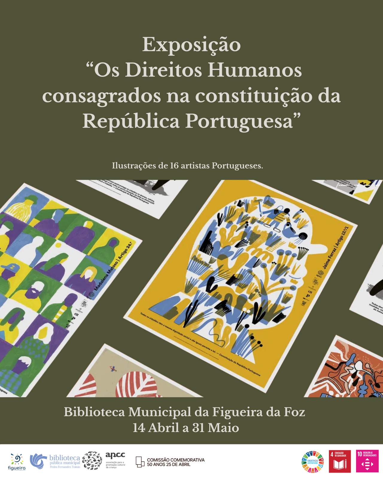 A Biblioteca Pública Municipal Pedro Fernandes Tomás (BPMPFT) tem patente ao público, até ao próximo dia 31 de maio, a exposição “Os Direitos Humanos Consagrados na Constituição Portuguesa”, uma iniciativa da Associação para a Promoção Cultural da Criança (APCC) em parceria com a comissão Comemorativa para os 50 anos do 25 de abril, que tem como principal objetivo divulgar os Direitos Humanos consagrados na Constituição da República Portuguesa. A entrada é livre.