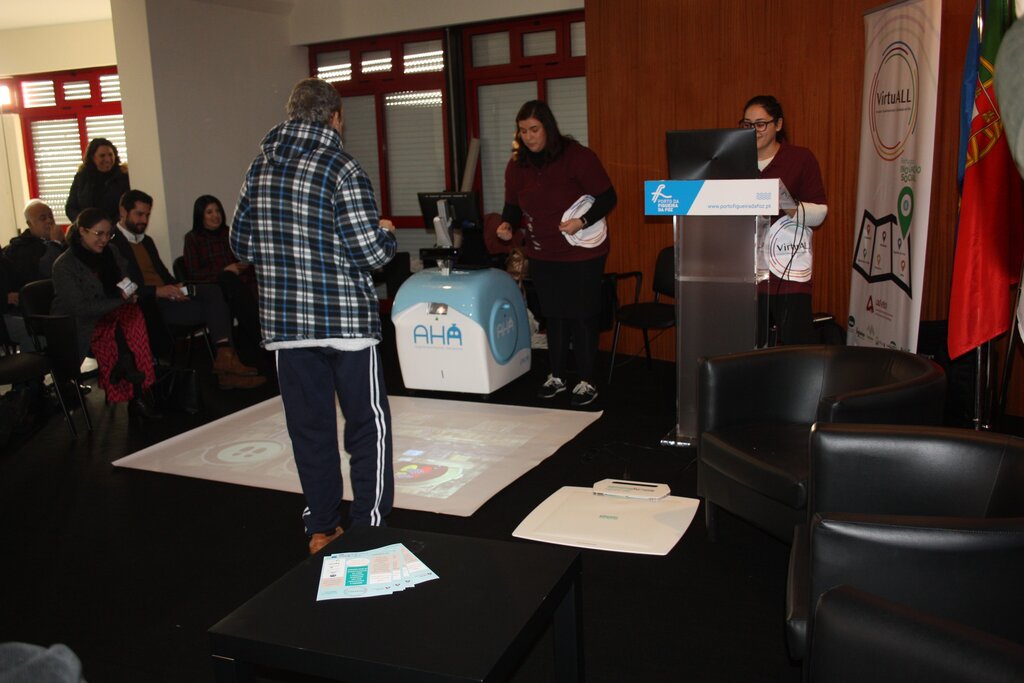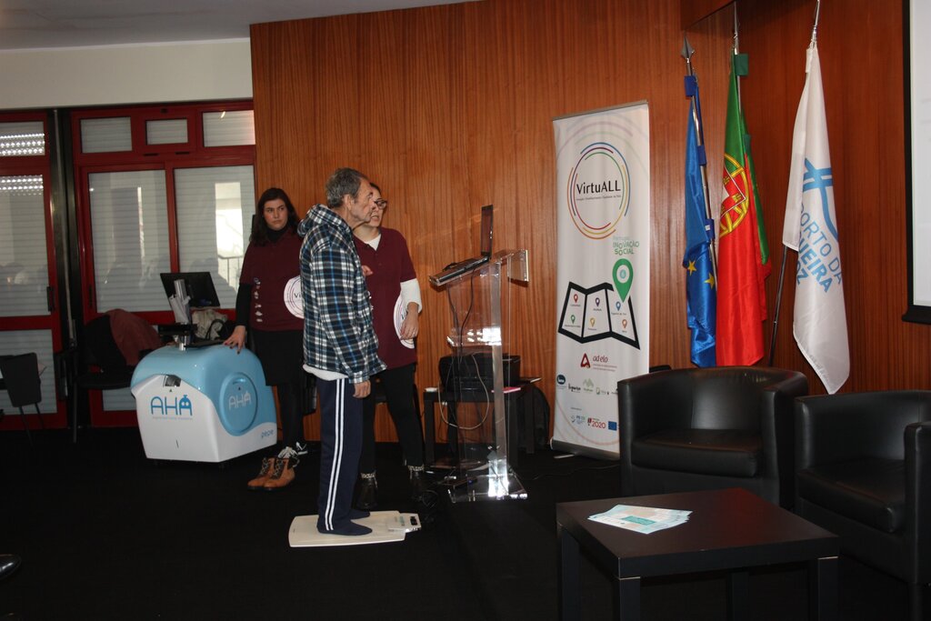 A apresentação do projeto VirtuALL contemplou ainda a demostração do funcionamento dos equipamentos tecnológicos, que no final do programa ficarão sob responsabilidade dos municípios. Uma plataforma que permite avaliar o equilíbrio, em que são propostos exercícios que depois resultam na demonstração da capacidade de equilíbrio frontal, posterior e lateral de cada um; uma balança que dá um conjunto de indicadores sobre a situação física da pessoa, como a massa corporal, índice de água e metabolismo, e o PEPE um equipamento de realidade virtual, com cinco jogos, que permite aos utilizadores, inclusive pessoas com mobilidade reduzida, realizar exercícios com carácter lúdico e complexidade diferenciada.