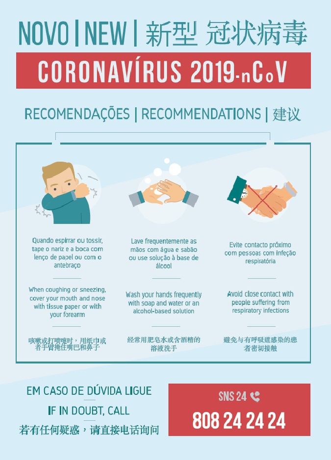 A Direção-Geral de Saúde (DGS) divulga no seu site, um conjunto de respostas acerca do novo Coronavírus (2019-nCoV). Com material de divulgação escrito em três línguas – português, inglês e mandarim – a DGS associa ainda duas perguntas: “Regressou da China?” ou “Contactou com um doente infetado?”