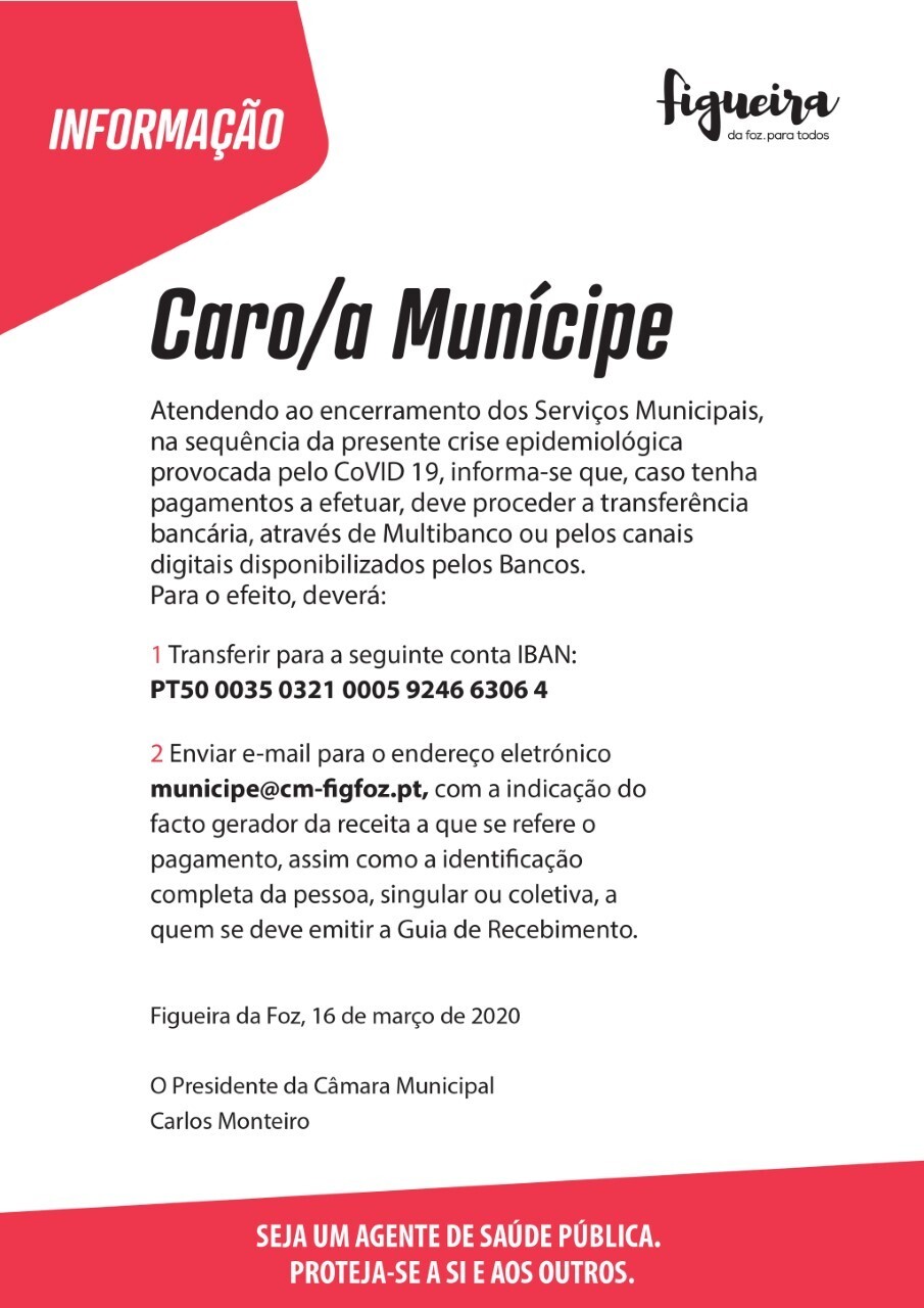 Atendendo ao encerramento dos Serviços Municipais, na sequência da presente crise epidemiológica provocada pelo CoVID 19, informa-se que, caso tenha pagamentos a efetuar, deve proceder a transferência bancária, através de Multibanco ou pelos canais digitais disponibilizados pelos Bancos.