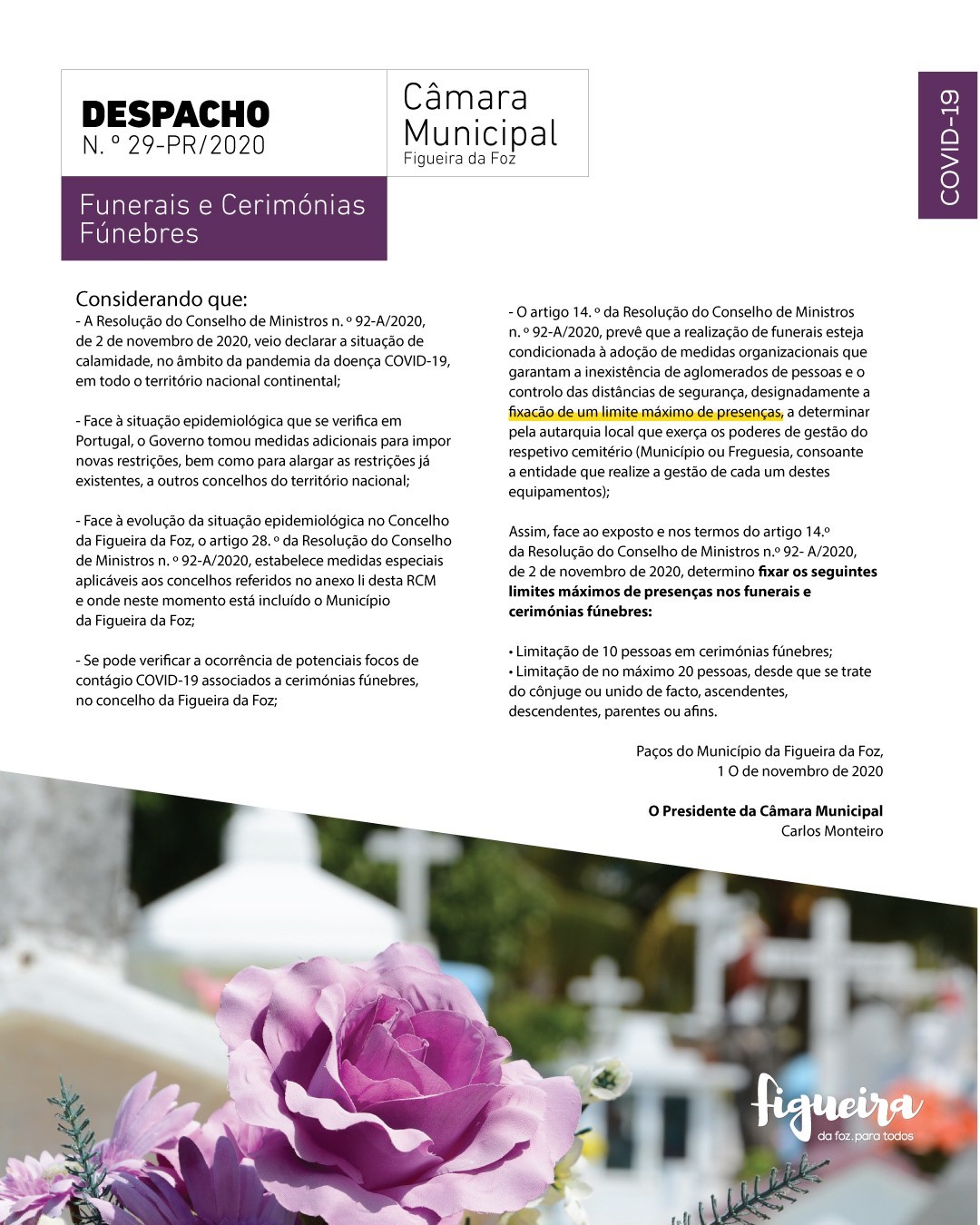 O Município da Figueira da Foz informa que, de acordo com o artigo 14º da Resolução do Conselho de Ministros nº 92-A/2020, que prevê que a realização de funerais esteja condicionada à adoção de medidas organizacionais que garantam a inexistência de aglomerados de pessoas e o controlo das distâncias de segurança, designadamente a fixação de um limite máximo de presenças, o Presidente da Câmara Municipal da Figueira da Foz determinou fixar os seguintes limites máximos de presenças nos funerais e cerimónias fúnebres: