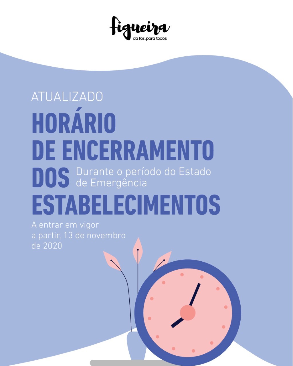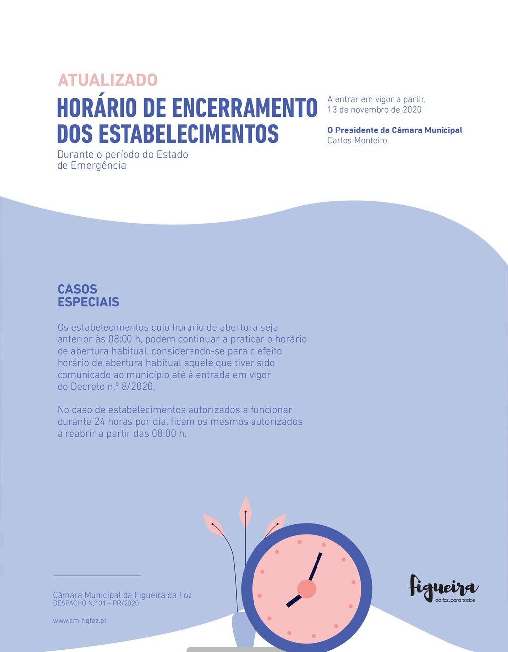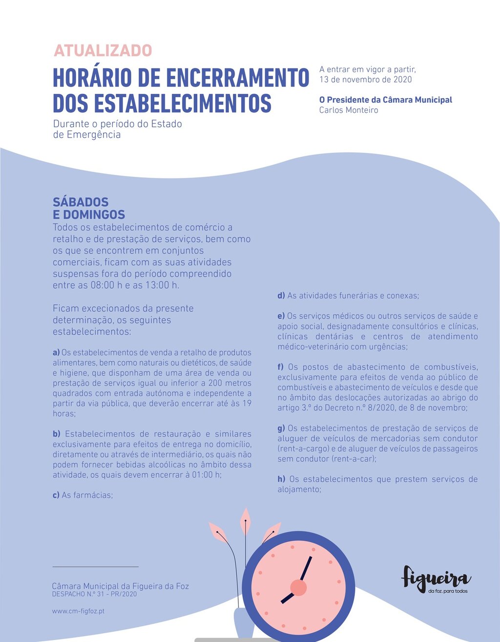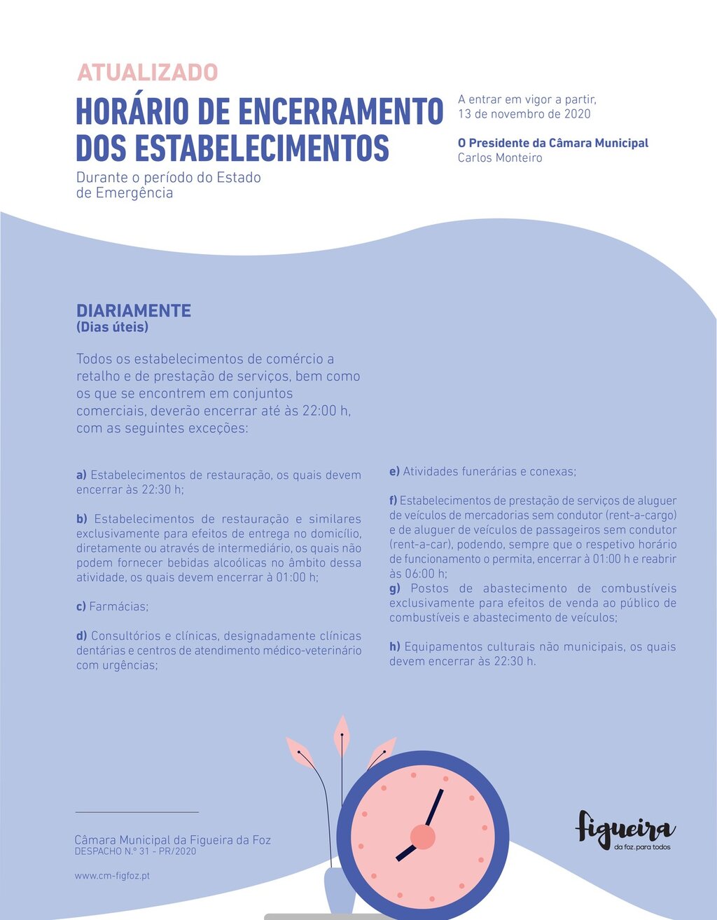 Na sequência das medidas aprovadas ontem em Conselho de Ministros, o Presidente da Câmara Municipal da Figueira da Foz, Carlos Monteiro, determina, por Despacho Nº31-PR de 13 de novembro de 2020, novos horários de encerramento dos estabelecimentos, a vigorar durante o Estado de Emergência.
