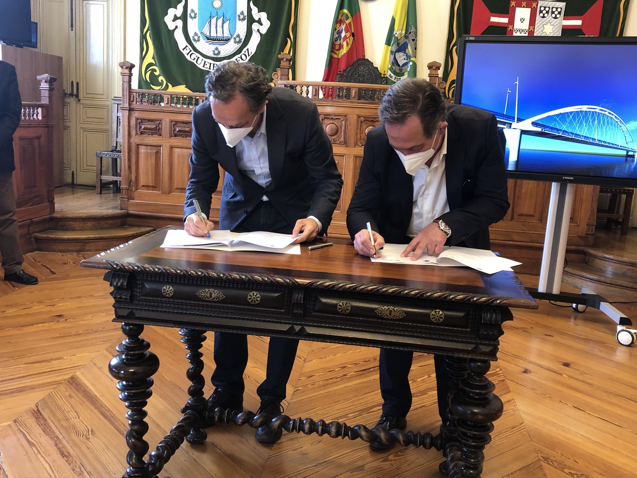O presidente da Câmara Municipal da Figueira da Foz, Carlos Monteiro e o vice-presidente do conselho diretivo da Agência Portuguesa do Ambiente (APA), José Pimenta Machado, assinaram ontem, quarta-feira, um protocolo que permite à autarquia tratar da gestão e manutenção das vias cicláveis de acesso à ponte a ser construída, no âmbito dos projetos Eurovelo 1 - Rota da Costa Atlântica e da Ciclovia do Mondego.
