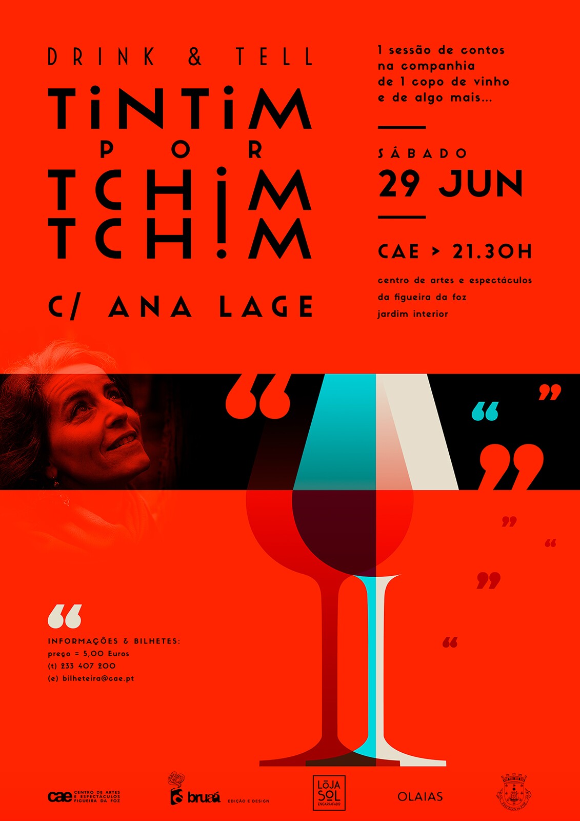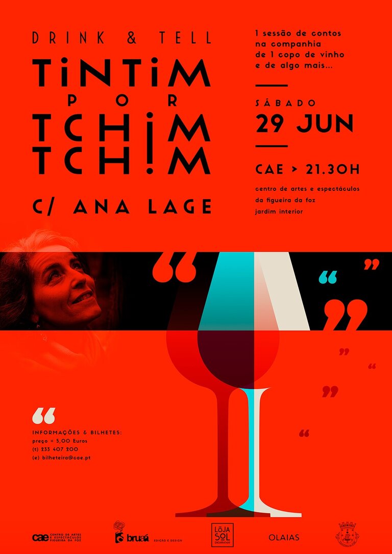Com organização conjunta da Bruaá e do CAE, e a parceria da Loja Sol Engarrafado e do Restaurante Olaias, o encontro Tintim por Tchim-Tchim pretende ser um tempo e espaço para ouvir e contar. Uma sessão de narração oral para adultos, ao qual se juntará o vinho, e algo a saborear, complementos perfeitos para uma noite de partilha, em que, juntos, teceremos essa trama feita de palavras e silêncios que faz dos contos poderosos instrumentos de pensamento que estimulam a fantasia, sensibilidade, memória e expressão. Esta sessão terá como convidada a contadora Ana Lage.