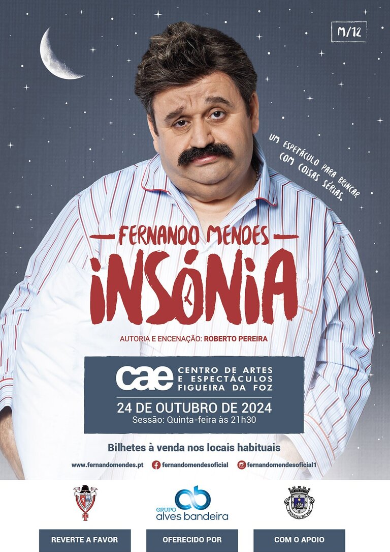 Com autoria e encenação de Roberto Pereira, em “Insónia” Fernando Mendes estará a solo e encarnará na pessoa de Custódio Reis, um vendedor de vinhos e licorosos, que vive com a corda no pescoço. Tanto financeiramente, como familiarmente. É o comum português de classe média, que vive afogado em dívidas e créditos. Custódio encontra-se à beira do divórcio. A mulher, Sónia, esgotou de vez a sua paciência para com um marido que é cada vez mais um falhado e um tipo sem rumo ou grandes objetivos de vida para além de comer, beber e dormir.