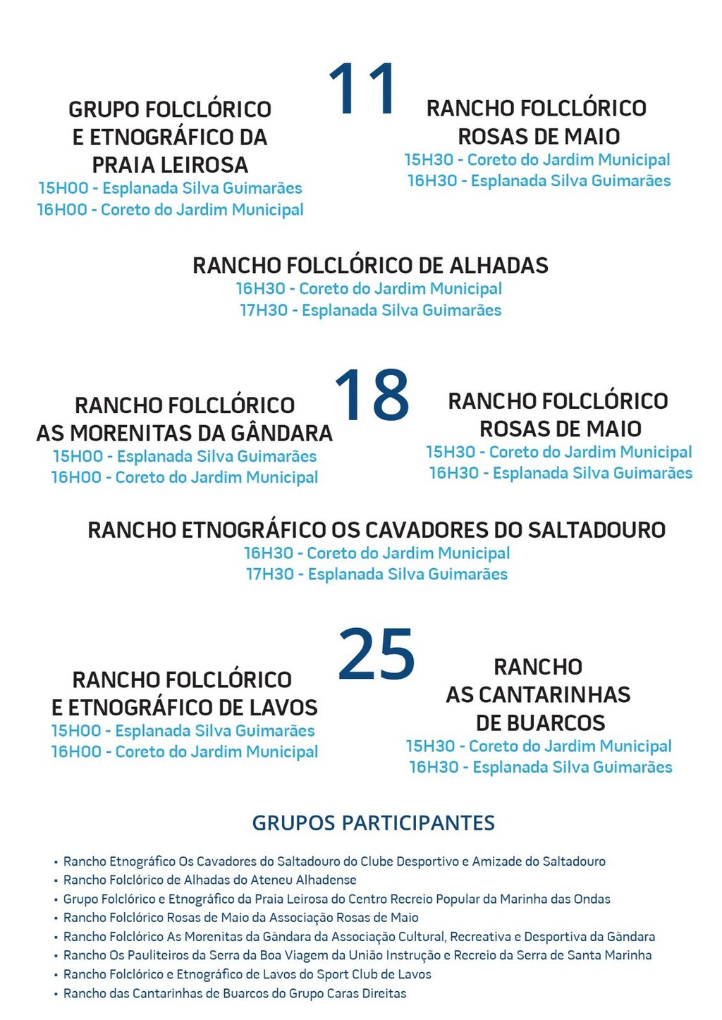 Este ano a edição contará com a participação: Rancho Etnográfico Os Cavadores do Saltadouro do Clube Desportivo e Amizade do Saltadouro; Rancho Folclórico de Alhadas do Ateneu Alhadense; Grupo Folclórico e Etnográfico da Praia Leirosa do Centro Recreio Popular da Marinha das Ondas; Rancho Folclórico Rosas de Maio da Associação Rosas de Maio; Rancho Folclórico As Morenitas da Gândara da Associação Cultural, Recreativa e Desportiva da Gândara; Rancho Os Pauliteiros da Serra da Boa Viagem da União Instrução e Recreio da Serra de Santa Marinha; Rancho Folclórico e Etnográfico de Lavos do Sport Club de Lavos e Rancho das Cantarinhas de Buarcos do Grupo Caras Direitas.
