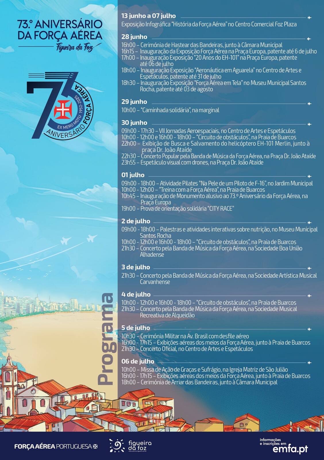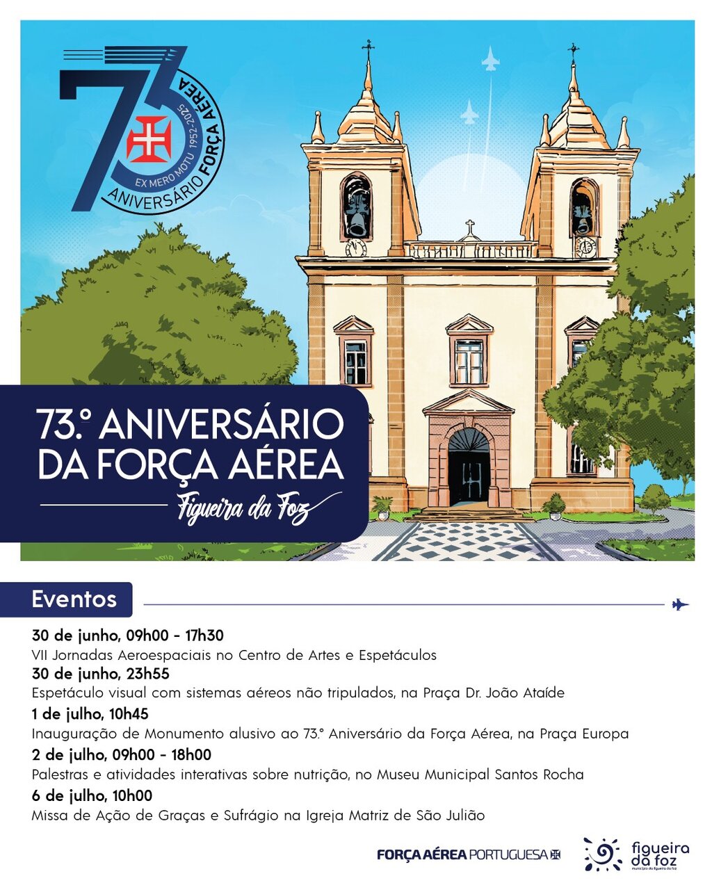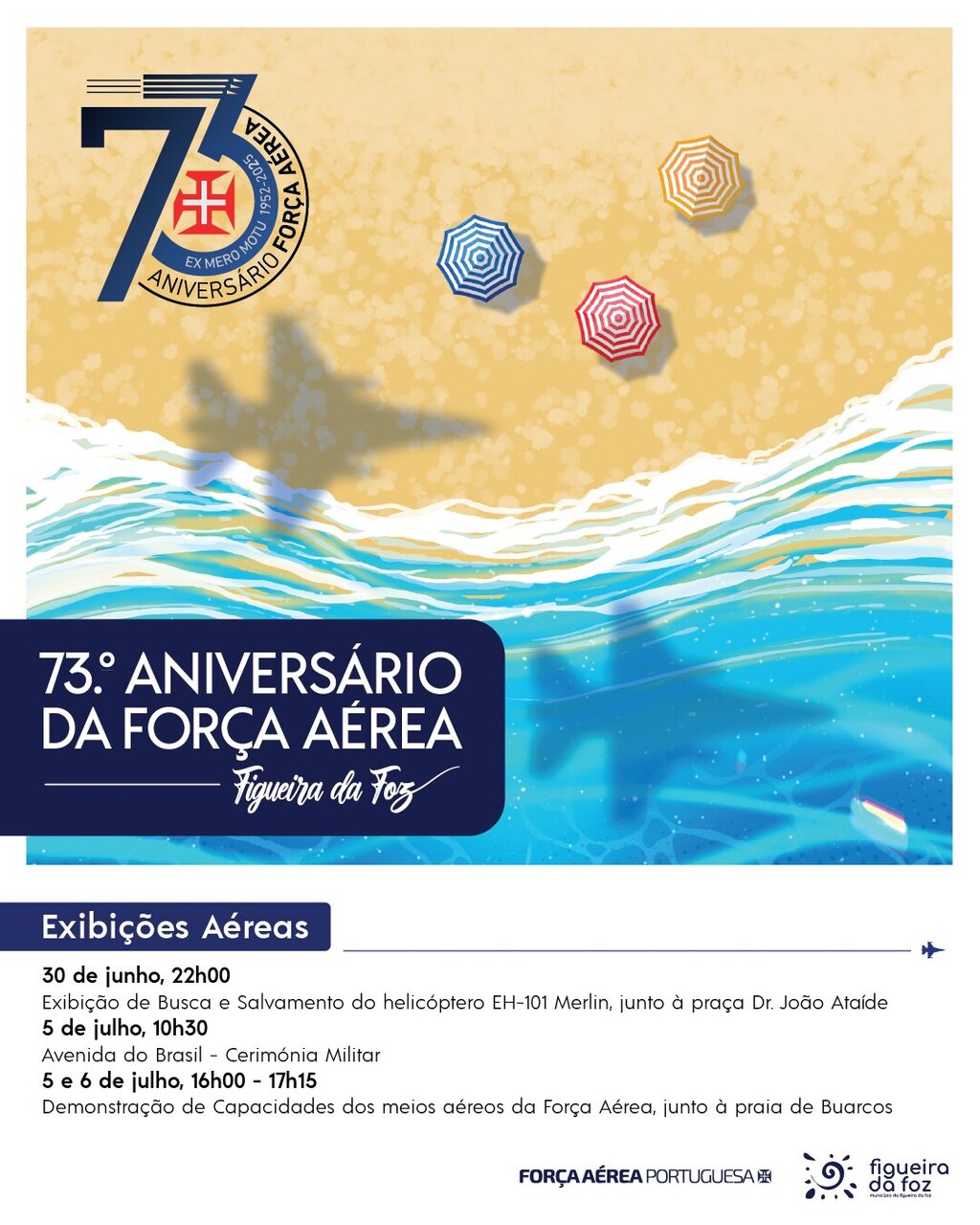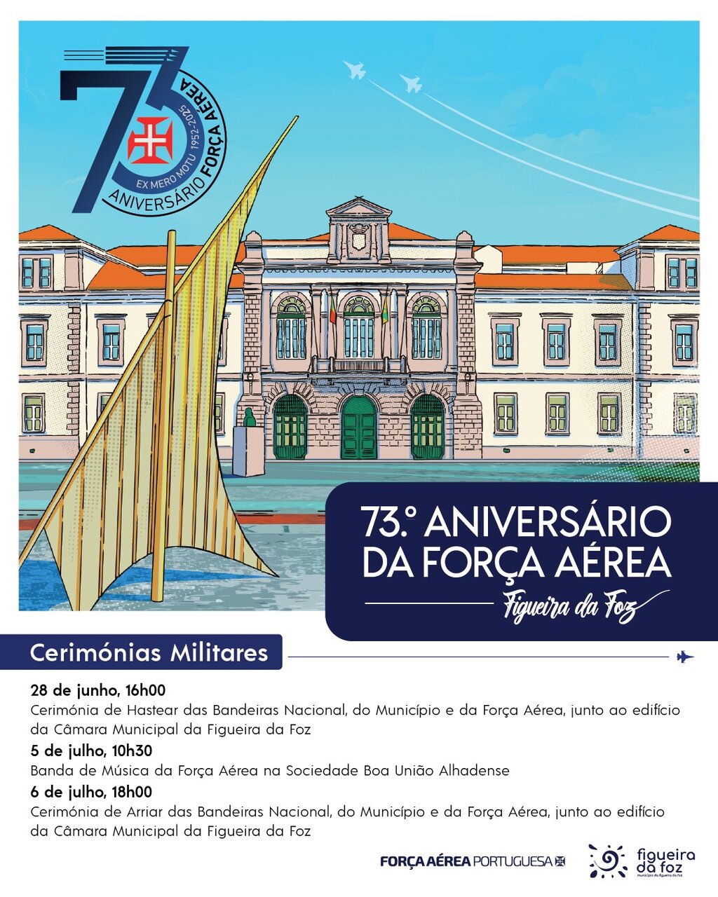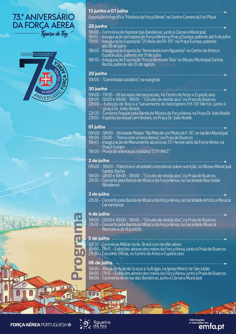 As Comemorações do 73.º Aniversário da Força Aérea Portuguesa, concentradas este ano na Figueira da Foz, têm o compromisso de dinamizar a cidade entre o dia 28 de junho e 6 de julho, através de um conjunto de atividades militares, científicas, culturais, lúdicas e desportivas, com o objetivo de dar a conhecer as capacidades aeroespaciais da Força Aérea, mas também promover uma aproximação à comunidade local.