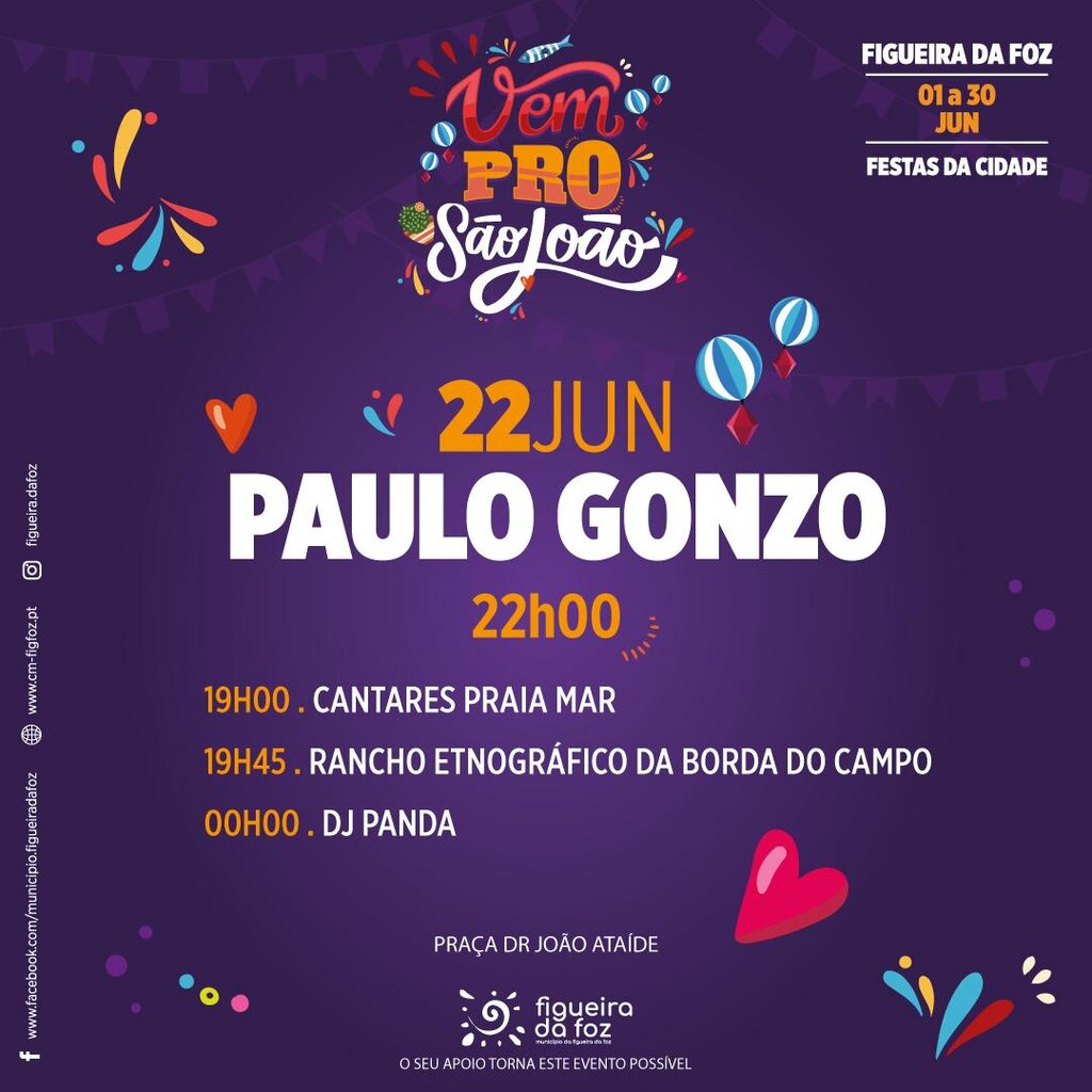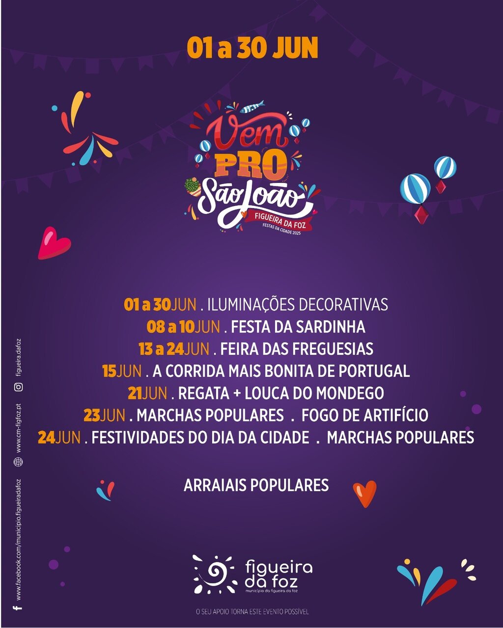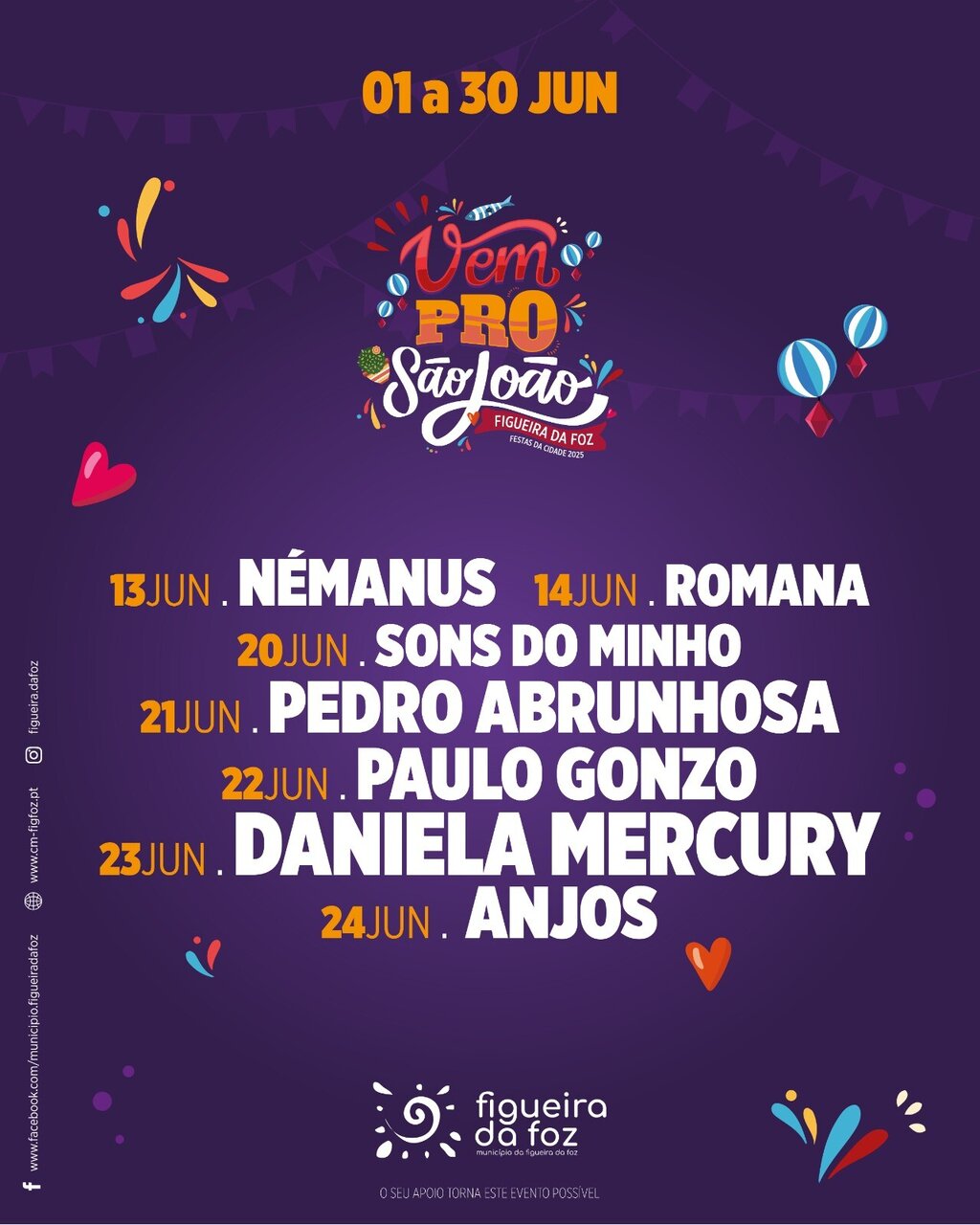 Com a celebração do São João, a edição de 2025 das Festas da Cidade vai animar a Figueira da Foz durante o mês de junho com a Festa da Sardinha e a Feira das Freguesias, onde para além dos grupos locais e da gastronomia das 14 freguesias do concelho, haverá concertos com artistas renomados do panorama artístico nacional e internacional- Némanus, Romana, Sons do Minho, Pedro Abrunhosa, Paulo Gonzo, Daniela Mercury e Anjos.