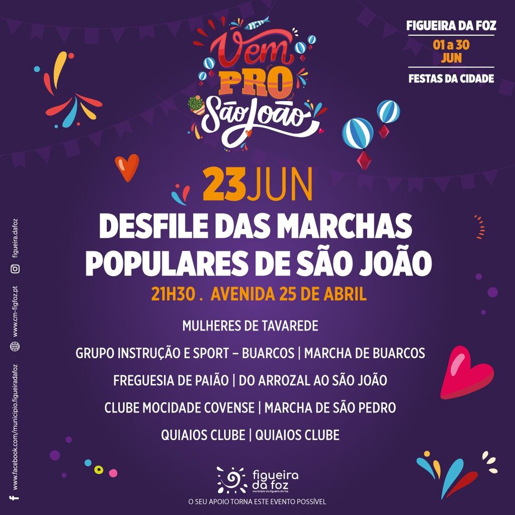 O Desfile das Marchas Populares, este ano uma mão cheia delas, decorre na Avenida 25 de Abril, no dia 23 de junho e no Coliseu Figueirense, no dia 24 de junho.