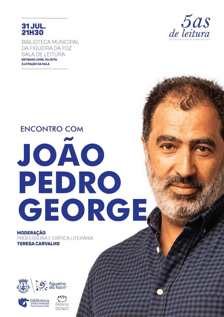 A Biblioteca Pública Municipal Pedro Fernandes Tomás recebe, no serão do último dia do mês de julho, o escritor e ensaísta João Pedro George, reconhecido pelo seu olhar crítico e interveniente sobre a sociedade portuguesa, para mais uma sessão do projeto de promoção e incentivo à leitura «5as de Leitura».