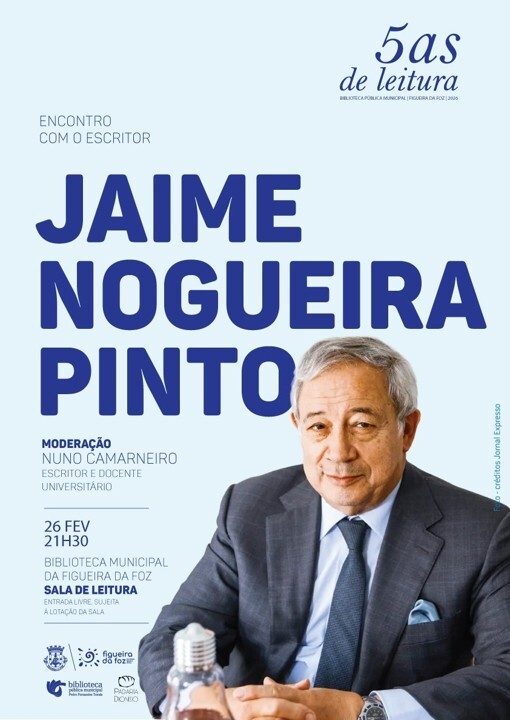 A Biblioteca Municipal promove mais uma sessão do ciclo 5as. de Leitura, que terá como convidado especial o prestigiado ensaísta e pensador político Jaime Nogueira Pinto, e como moderador o escritor e docente universitário figueirense, Nuno Camarneiro.