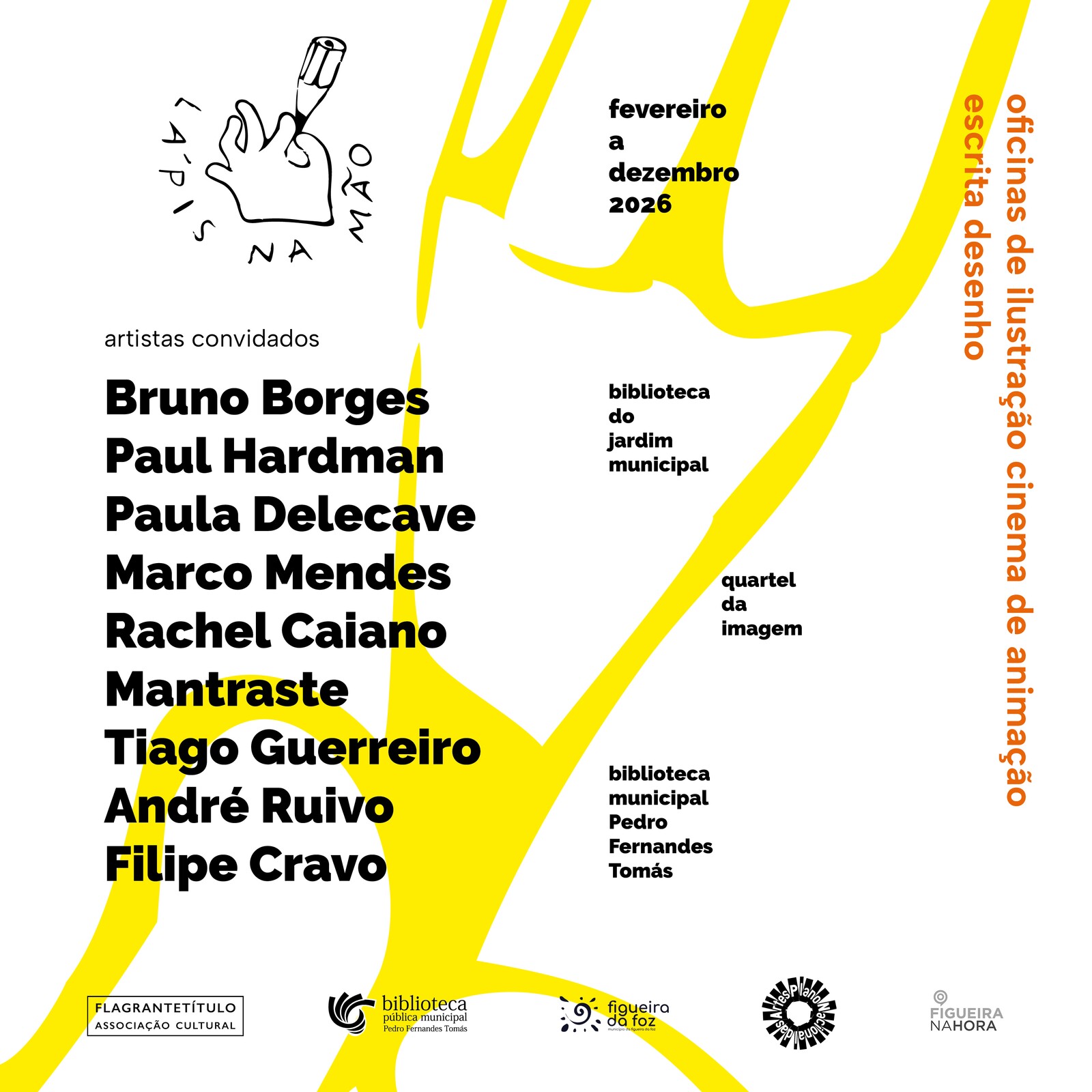 O Município da Figueira da Foz promove, através da Divisão de Biblioteca, Auditório e Arquivos, ao longo de 2026, um programa de 12 oficinas artísticas nas áreas do desenho, ilustração, escrita criativa e animação, desenvolvido em parceria com a FLAGRANTETÍTULO — Associação Cultural e com o apoio do Plano Nacional de Artes.