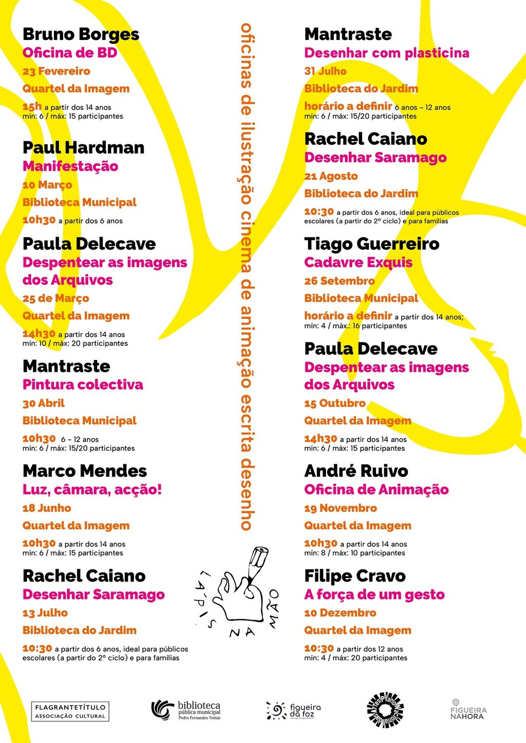 Desenhar Saramago, Regresso ao Passado-Presente-Futuro (Um mergulho no espólio fotográfico da Figueira da Foz / Despentear as imagens dos Arquivos), Uma Oficina de BD, Oficina de Cartazes para a Pequena Paz, -, Luz, Câmara, Acção!, Oficina curta de animação e Cadavre Exquis são algumas das oficinas que terão lugar.