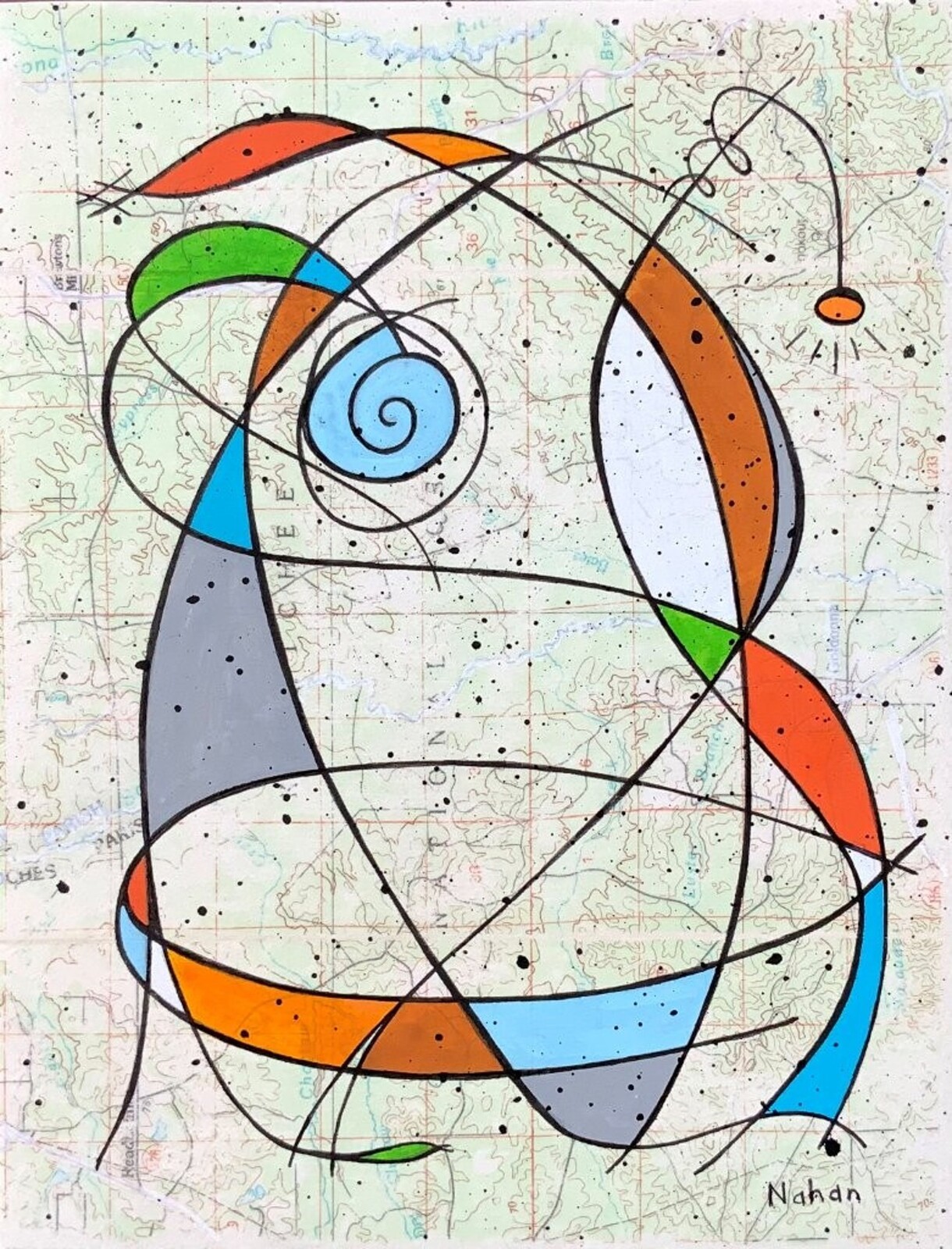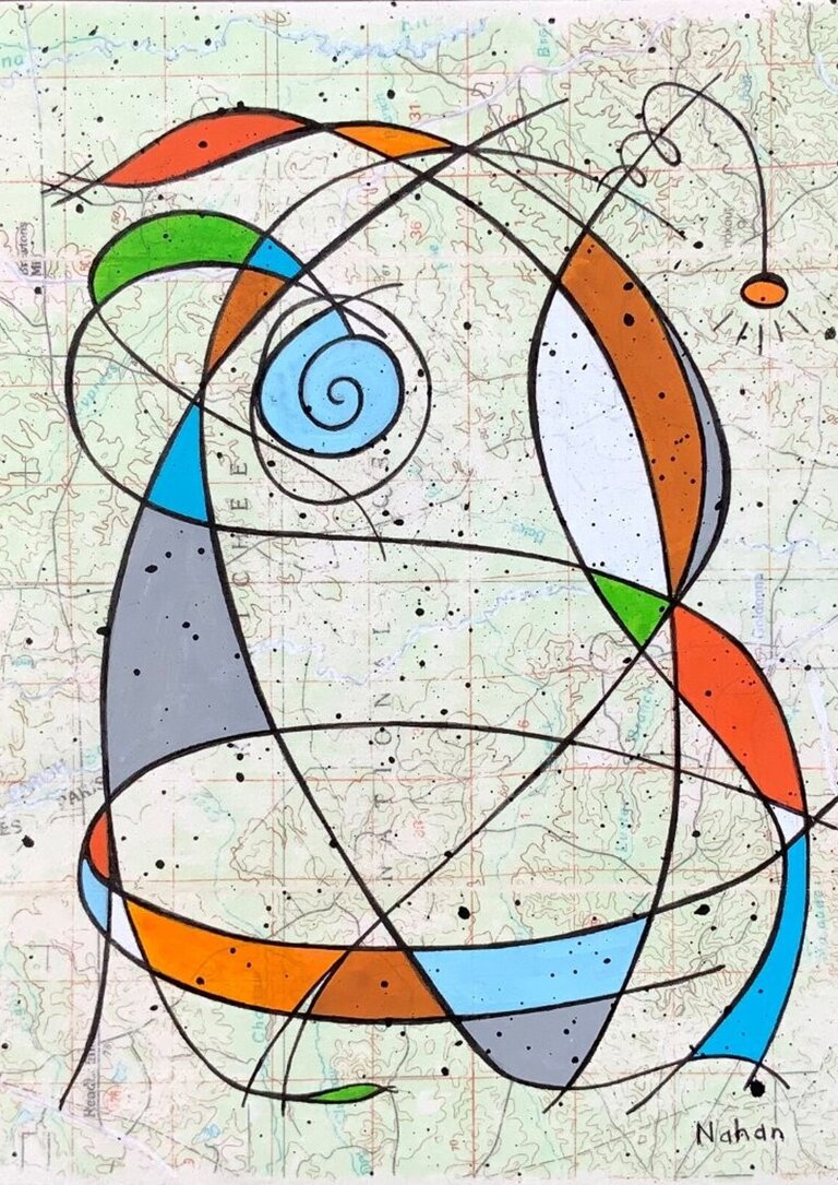 Em “Flux”, Ken Nahan explora o equilíbrio dinâmico entre ordem e movimento — o processo contínuo de transformação que define tanto a natureza quanto o ato criativo. A exposição reúne obras sobre cartas náuticas, colagens e papéis artesanais, cada suporte servindo como uma superfície distinta para a improvisação. Nas cartas, os gestos pintados fluem sobre linhas geográficas como se traçassem correntes invisíveis sob as superfícies medidas do mundo. Em contraste, os desenhos menores sobre papel artesanal — íntimos, rítmicos e contidos — revelam o mesmo sentido de movimento destilado à sua essência.