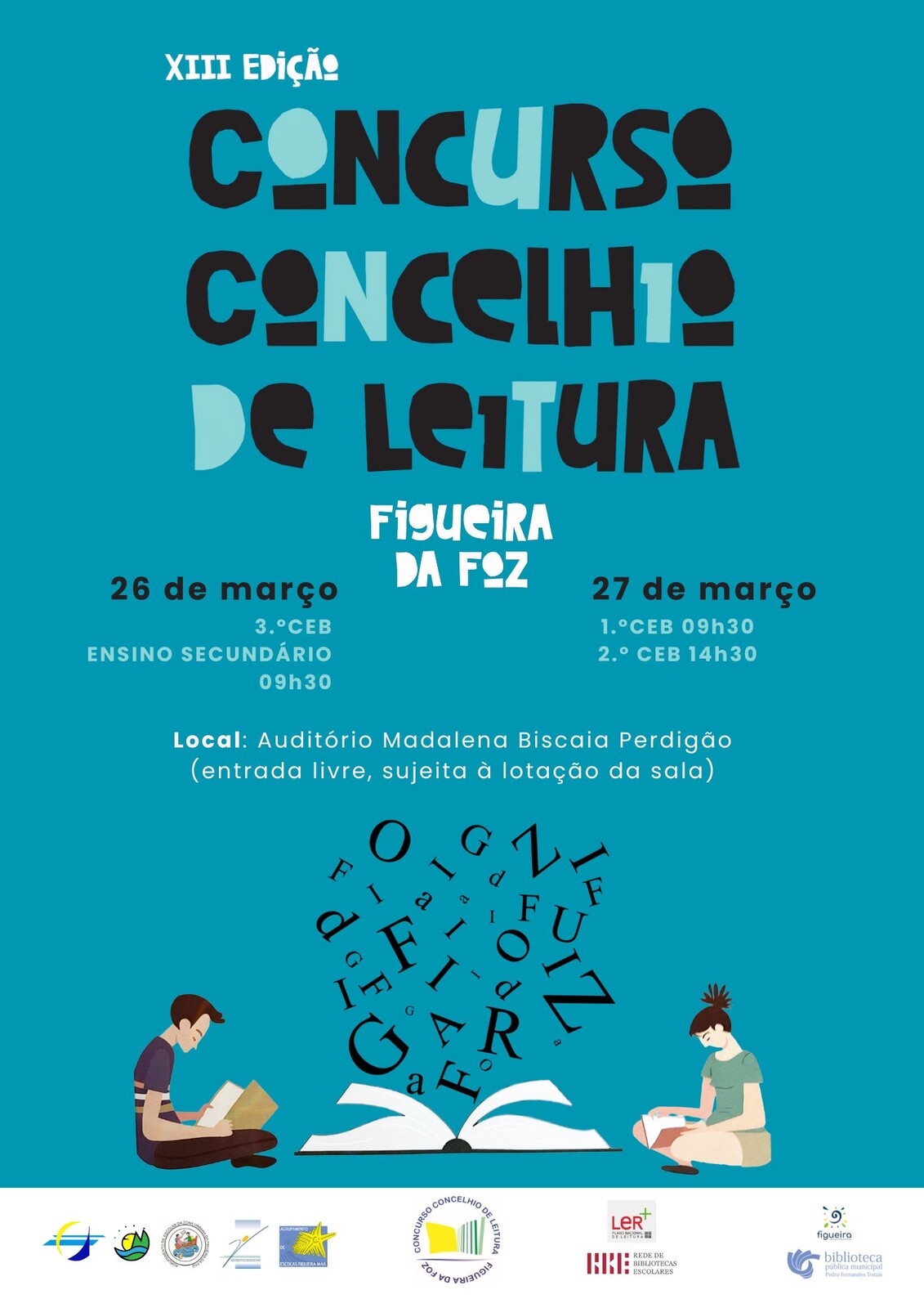 Realizam-se dia 26 de março, no Auditório Madalena Biscaia Azeredo Perdigão, as provas finais do 3º Ciclo do ensino Básico e do Ensino Secundário e no dia 27 de março as do 1º Ciclo do Ensino Básico e as do 2º. Ciclo de ensino, da XIII edição do Concurso Concelhio de Leitura da Figueira da Foz.
