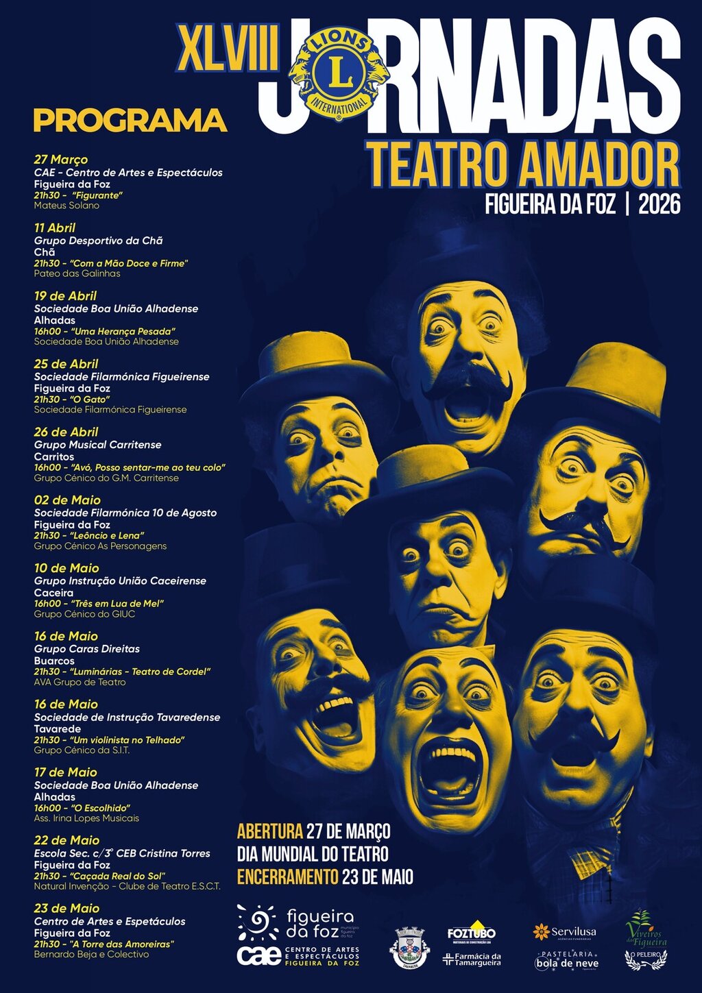As Jornadas de Teatro Amador da Figueira da Foz, promovidas pelo Lions Clube da Figueira da Foz, como vem sendo habitual, têm início a 27 de março, Dia Mundial do Teatro, no Grande Auditório do Centro de Artes e Espetáculos da Figueira da Foz (CAE), que recebe a peça de abertura, “Figurante”, com Mateus Solano, e de encerramento, “A terra das amoreiras”, com o grupo Bernardo Beja Coletivo, as únicas com a participação de atores profissionais.