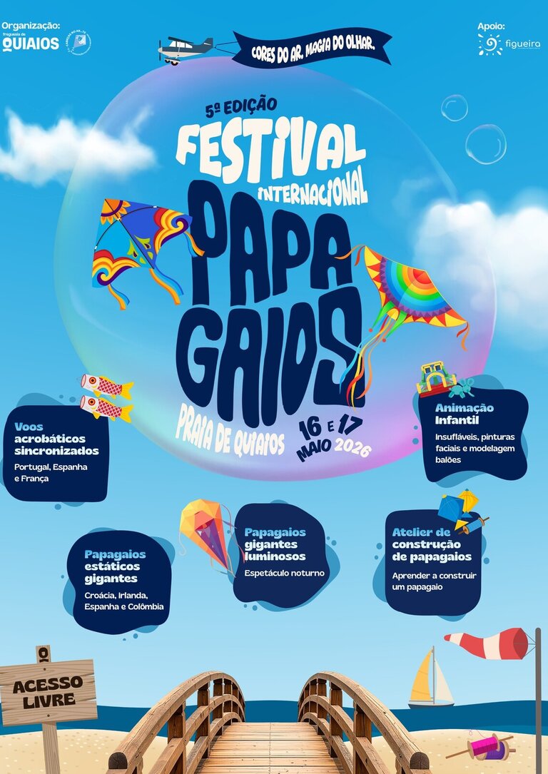 A Praia de Quiaios recebe, nos dias 16 e 17 de maio, a quinta edição do Festival Internacional de Papagaios, um evento gratuito que promete transformar o céu atlântico num espetáculo de cor, movimento e criatividade, pensado para toda a família.