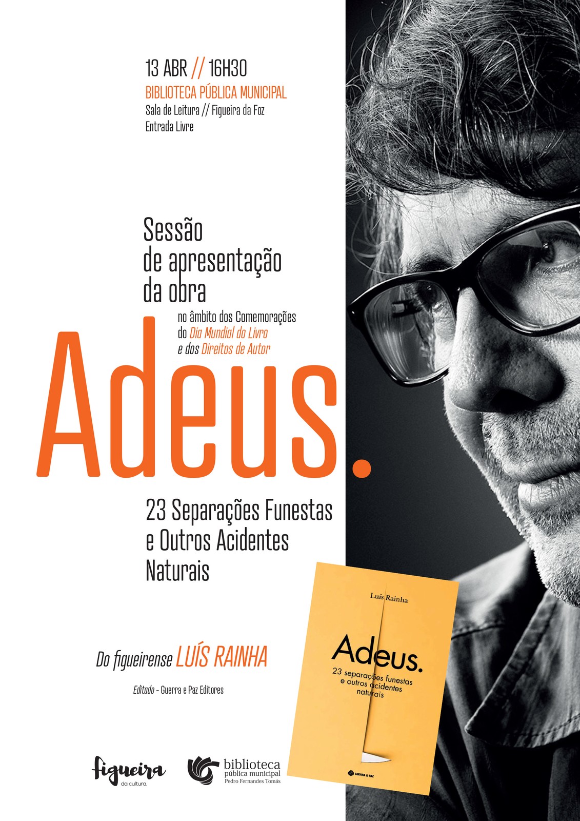 A Biblioteca Municipal promove, dia 13 de abril, pelas 16h0, na Sala de Leitura, no âmbito da comemoração do Dia Mundial do Livro e dos Direitos de Autor, a sessão de apresentação do livro de contos «Adeus. 23 Separações Funestas e Outros Acidentes Naturais», de Luís Rainha, com edição da Guerra e Paz Editora.