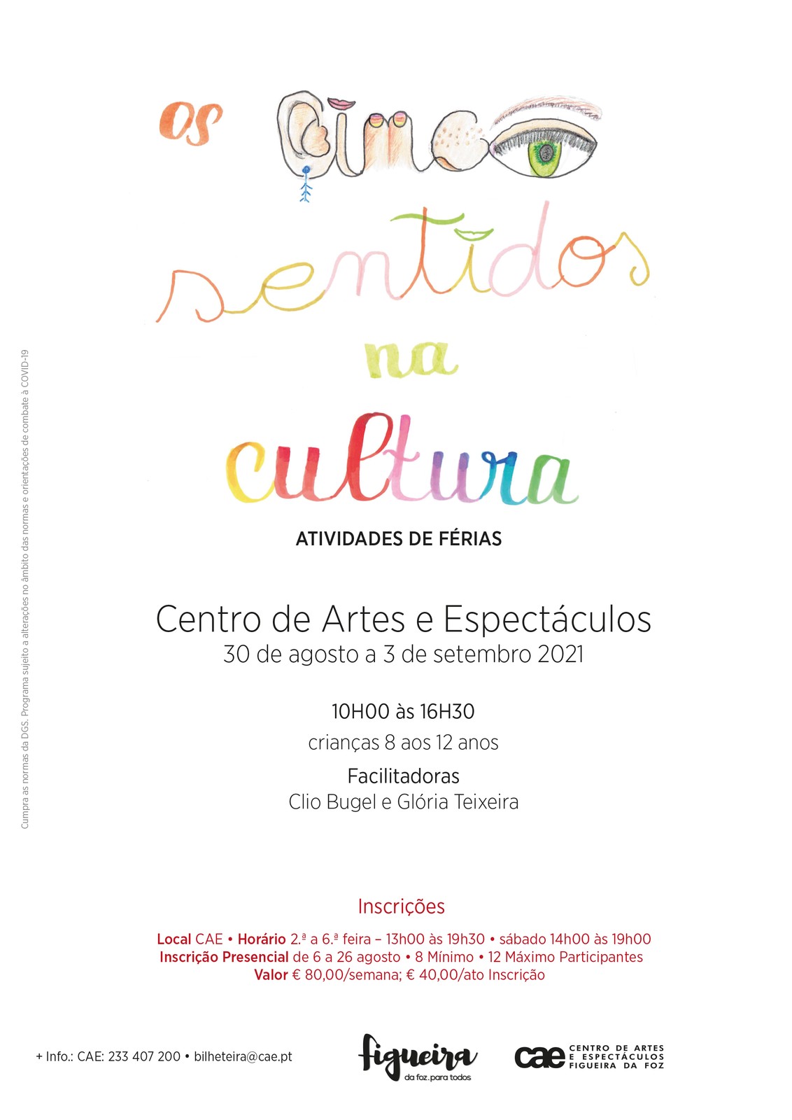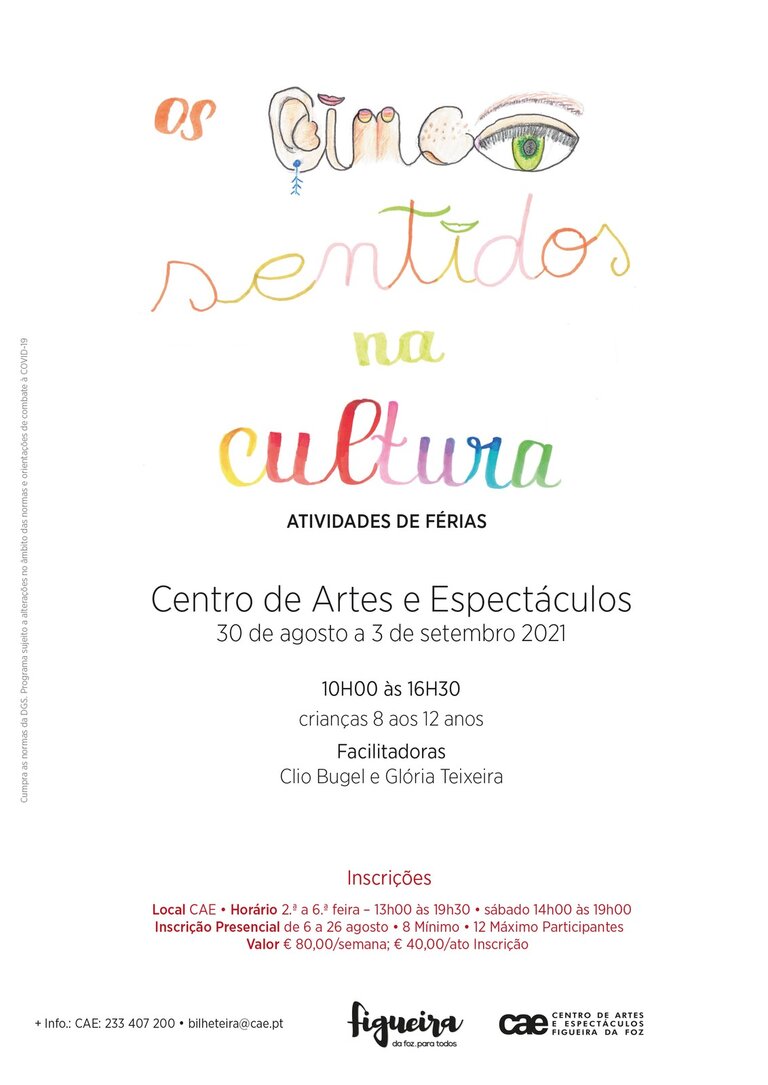 A atividade de férias “Os cinco sentidos na Cultura” irá funcionar na pausa letiva de verão, de 30 de agosto a 3 de setembro 2021, devendo os encarregados de educação efetuar a inscrição do seu próprio educando.